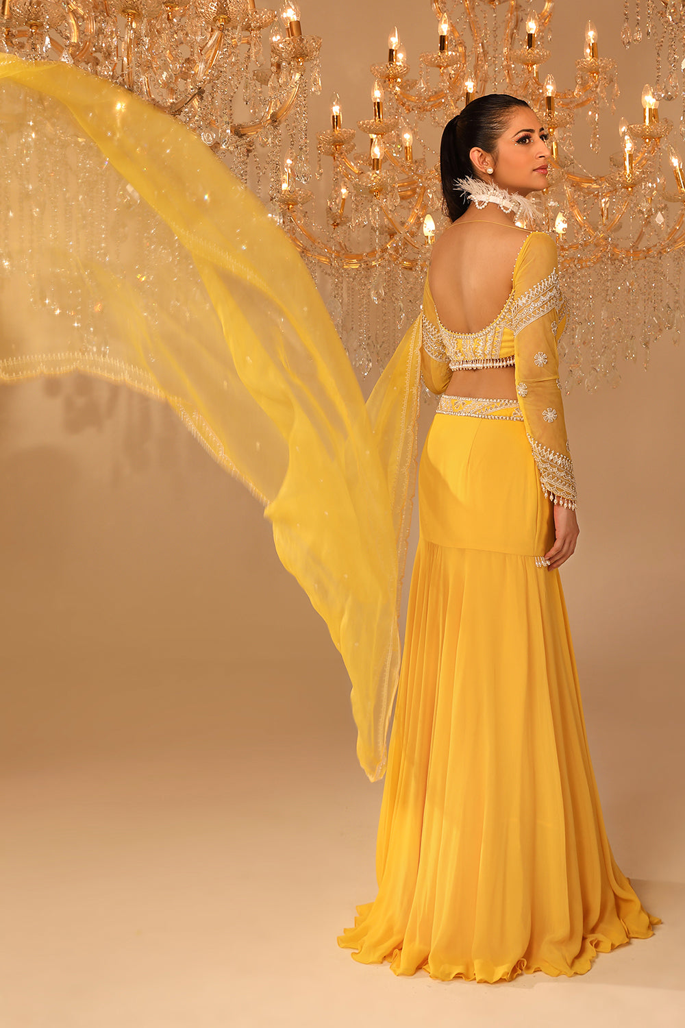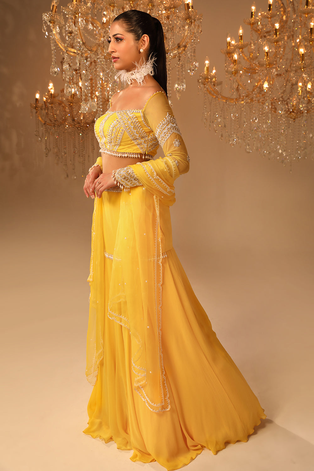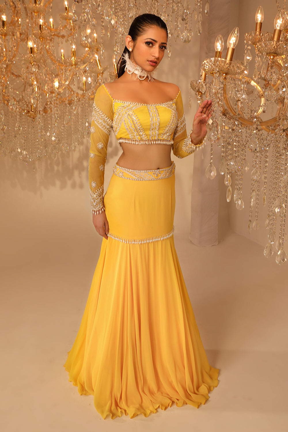 This drop shoulder embroidered full-sleeve blouse and georgette fitted lehenga paired with embroidered net dupatta is absolutely makes you look stunning, have an attention to details which are truly remarkable. I am eagerly looking forward to seeing how you rock this gorgeous Set.