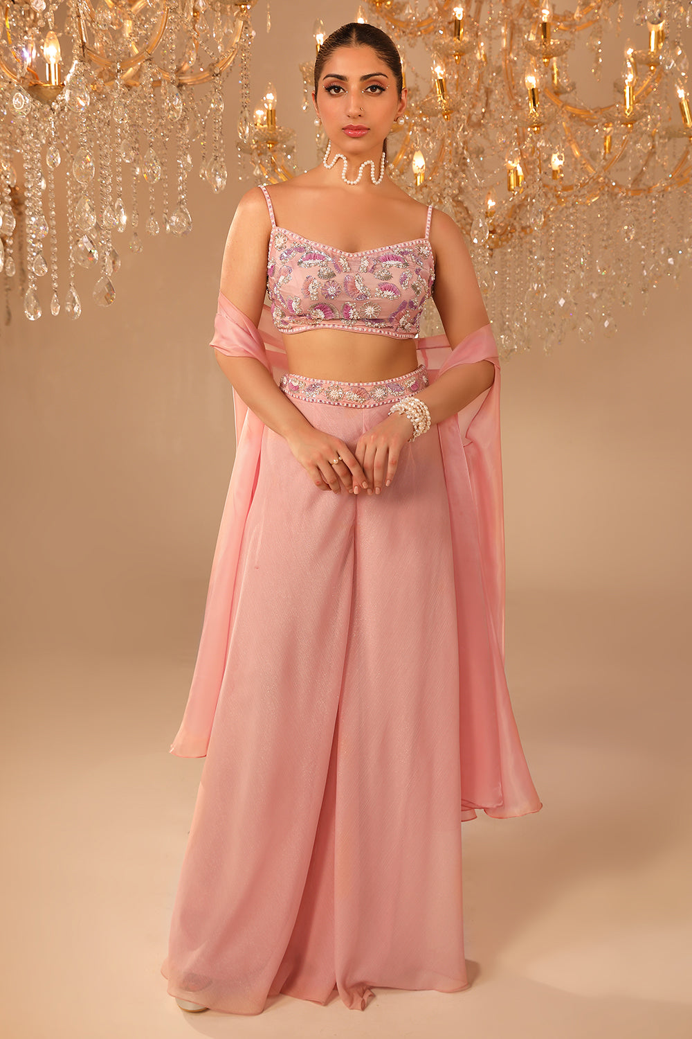 As you gaze upon the pink 3D embroidered noodle strap blouse and metallic georgette plazo paired with long cape, you can't help but feel like you're in a fairy tale. The delicate 3D embroidery on the blouse adds a touch of magic to the garment, The long cape flutters behind you like the wings of a butterfly, adding a sense of enchantment to this already beautiful ensemble. Get ready to feel like a princess in this stunning outfit, perfect fit for you.