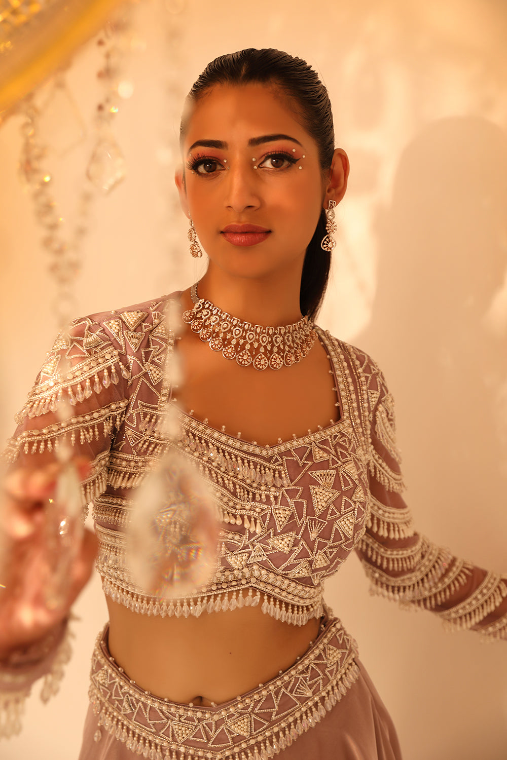 This ensemble is truly fit for a queen ! The asymmetric jewelled blouse paired with an organza skirt and ruffle dupatta creates a dreamy and ethereal look that is perfect for royal lady like you. The jewelled blouse adds grace to the garment, while the organza skirt creates a flowy and graceful look. The ruffle dupatta adds a playful and feminine touch to this already gorgeous outfit.