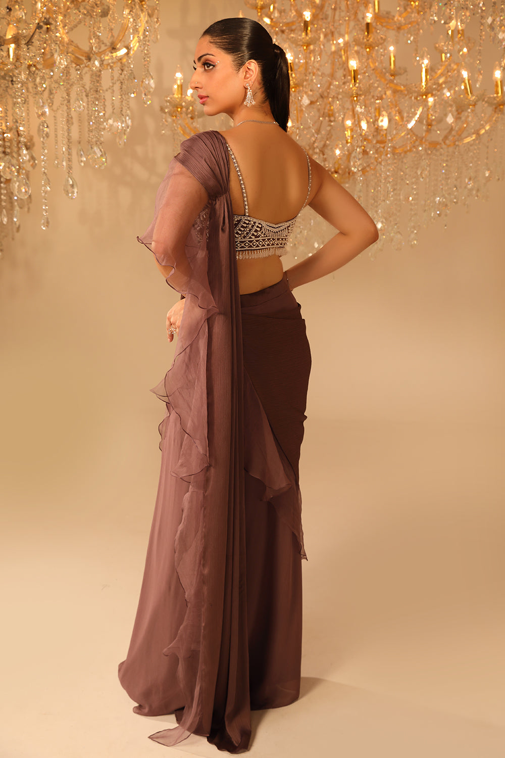 As you slip into this plum wine heavy embroidered pearl and crystal drop blouse with georgette gathered draped saree with ruffle frills, you feel like the star of your own masterpiece. The heavy embroidery on the blouse adds a touch of elegance to the garment, while the georgette gathered draped saree creates a flowy and graceful look. The ruffle frills add a playful and feminine touch to this already gorgeous outfit, and as you twirl in front of the camera, you feel like a true leading lady. This ensemble is sure to turn heads and make you look and feel like one you are !