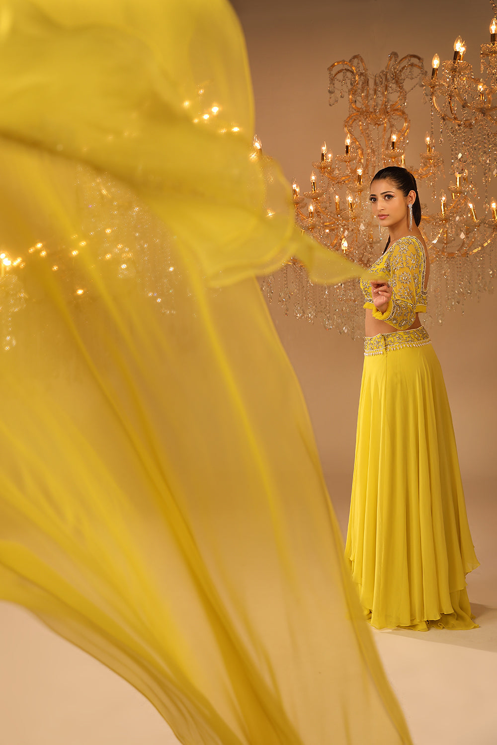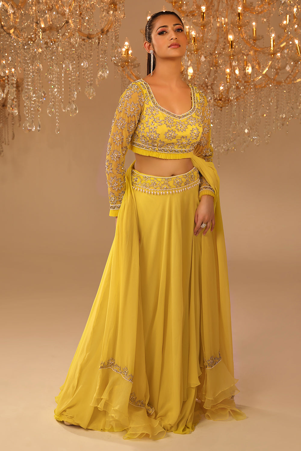 This ensemble is truly a work of art, fit for a leading lady like you ! The two layered georgette skirt with embroidered blouse and georgette and organza Ruffled Dupatta creates a dreamy look, Get ready to show off your inner royalty and make a statement in this stunning ensemble!