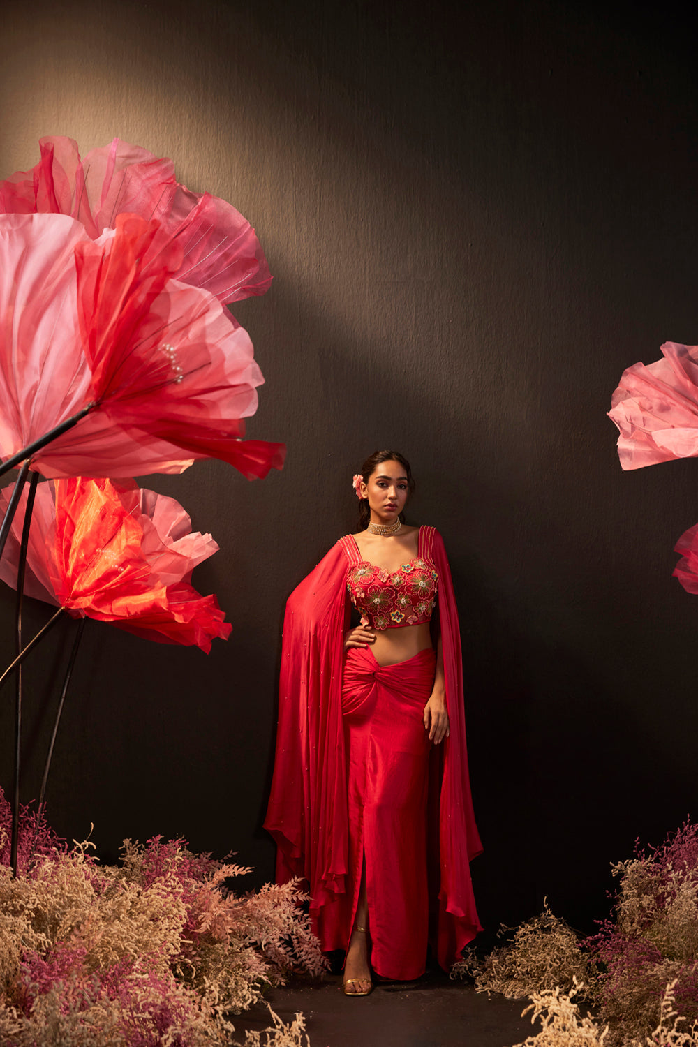An alluring pair of a corset blouse & knotted skirt. meticulously tailored, the corset accentues your silhouette with hand embroidery while the cape-like sleeves add a touch of drama. and finally, the skirt completes the ensemble, giving it a final touch of grace.
