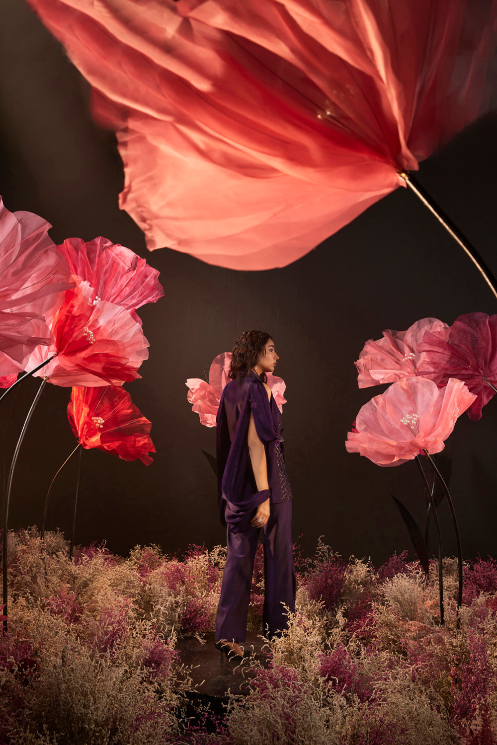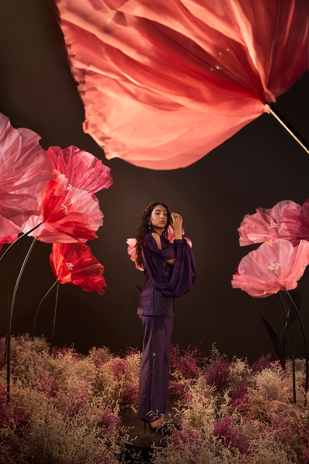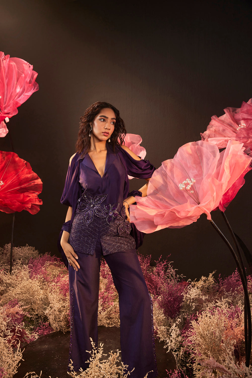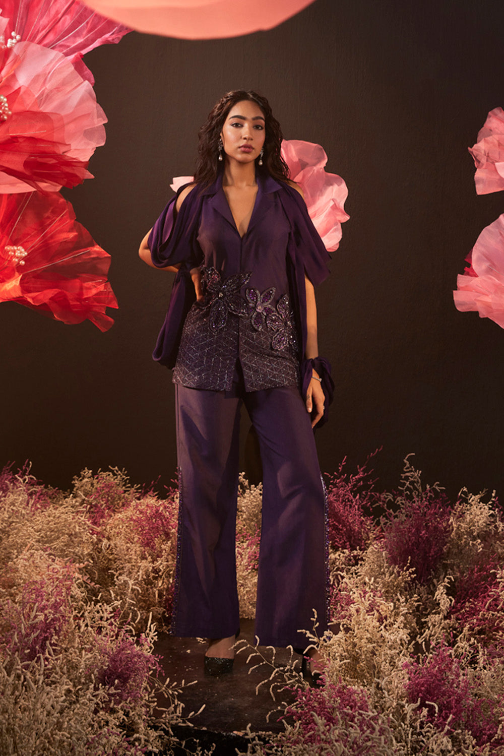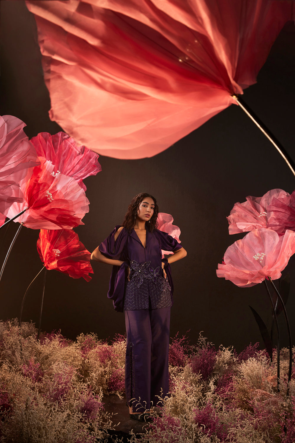 A chic ensemble designed for when you want to set trends, featured here is a red collared jacket paired with flared pants. embodying embroidered florals, what catches eyes is the graceful draping of the sleeves.