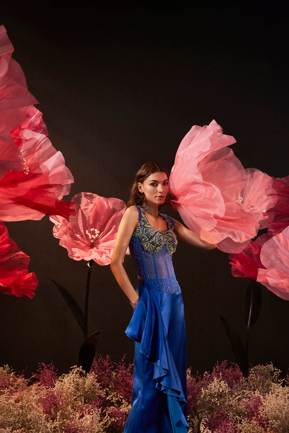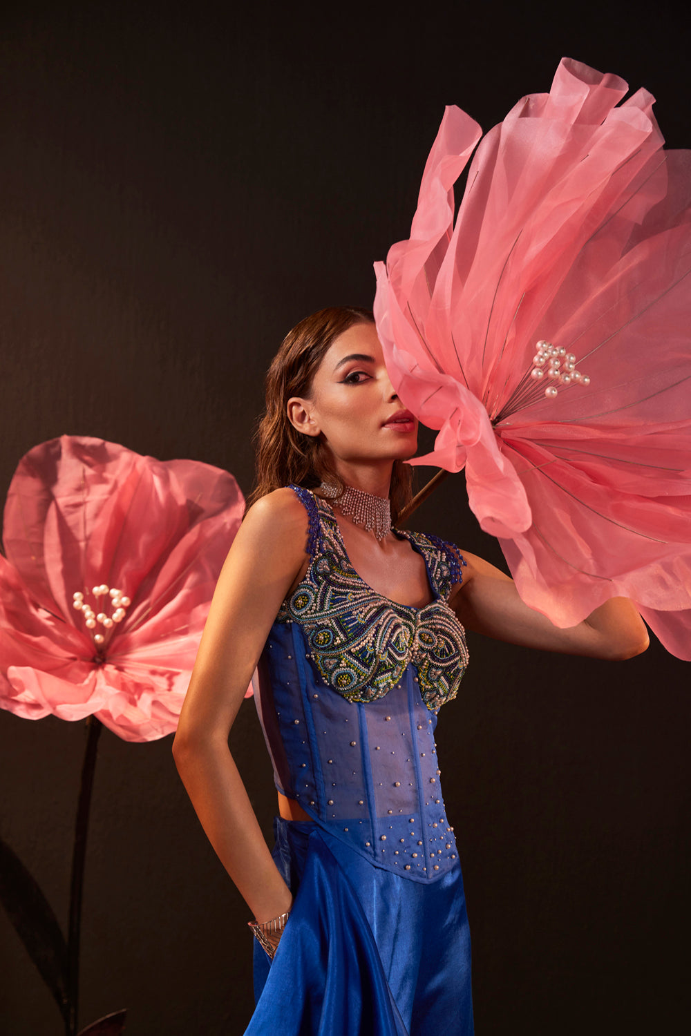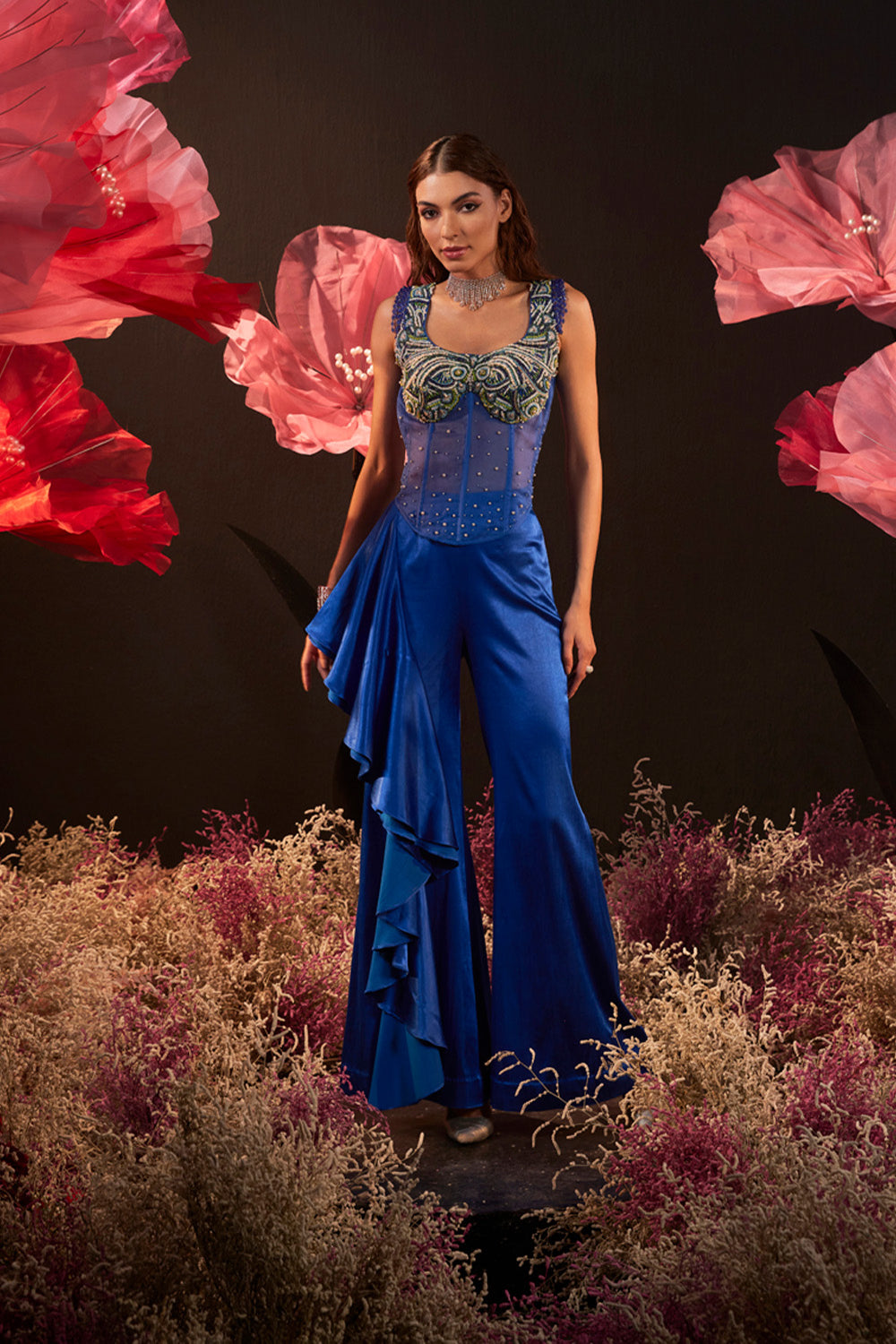 A dreamy corset blouse featuring intricate embroidery all over paired with fit-&-flare pants, the outfit features equal amounts of spunk as it does elegance.