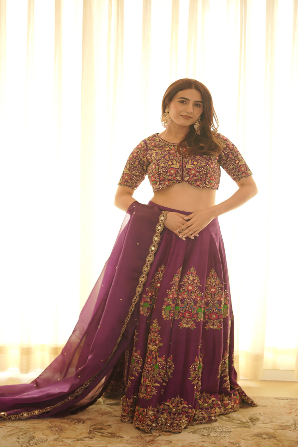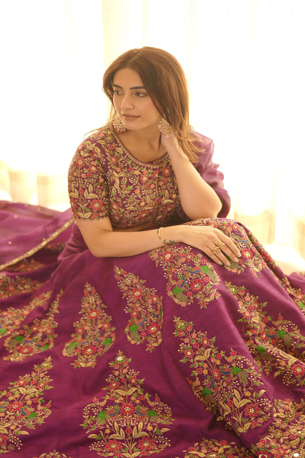 An opulent ensemble in purple, this ensemble features an intricately designed lehenga skirt adorned with floral and peacock motifs paired elegantly with a heavily embroidered blouse. designed with details that catch the eye, it comes with a mirror work dupatta that exudes grace and elegance through every seam.