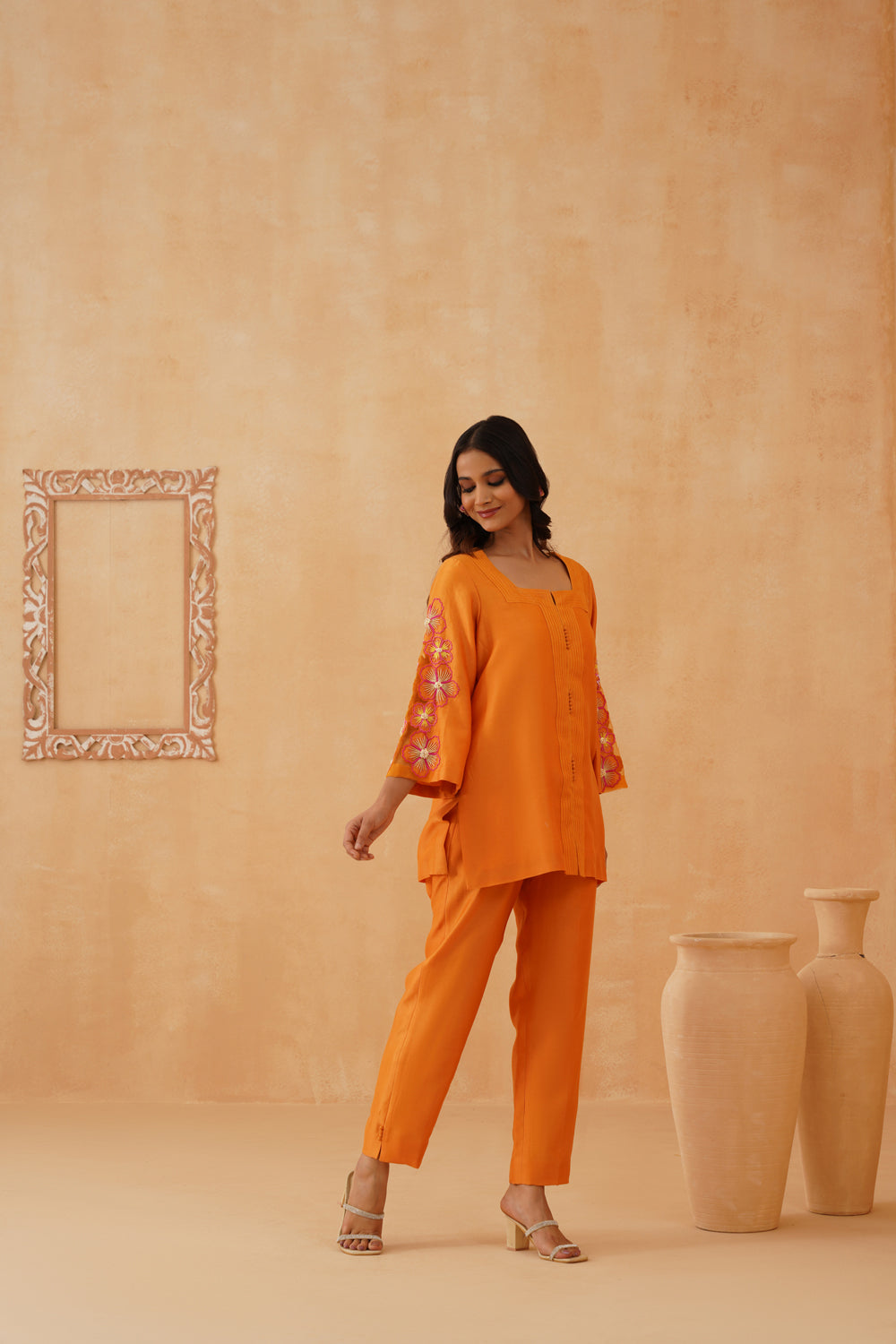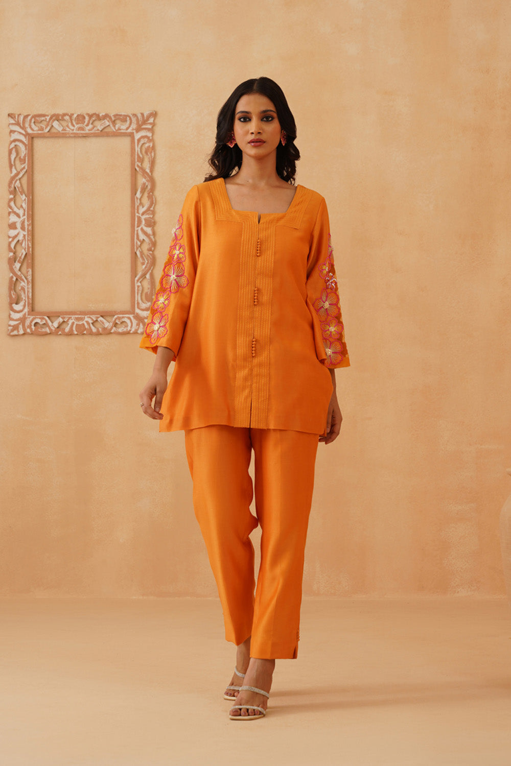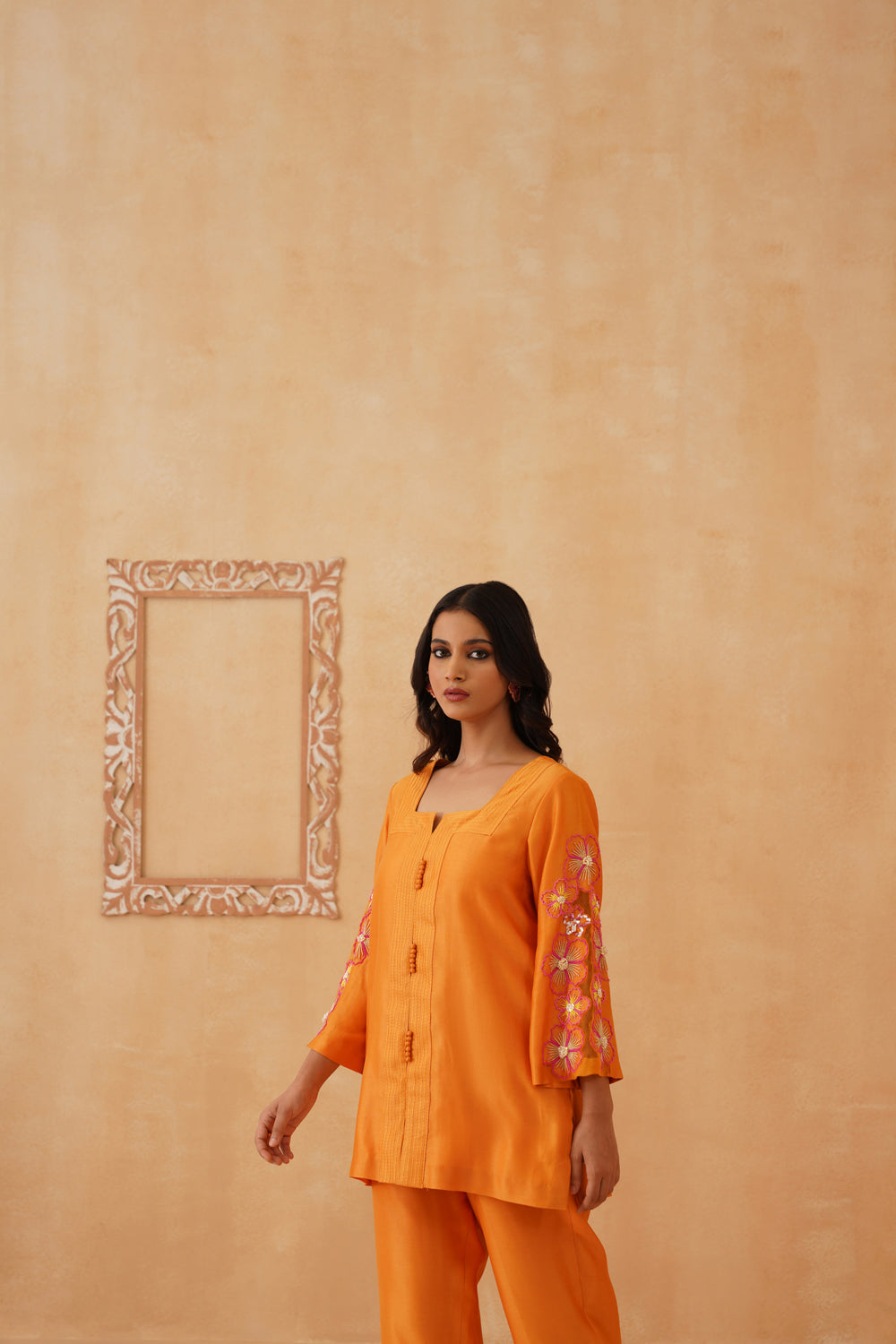 This coord set features a running stitch along the center placket with potli buttons. the sleeves steal the spotlight, with their floral beaded embroidery and a slit of organza. the pants complement the look with a 1” slit and potli buttons on the side.