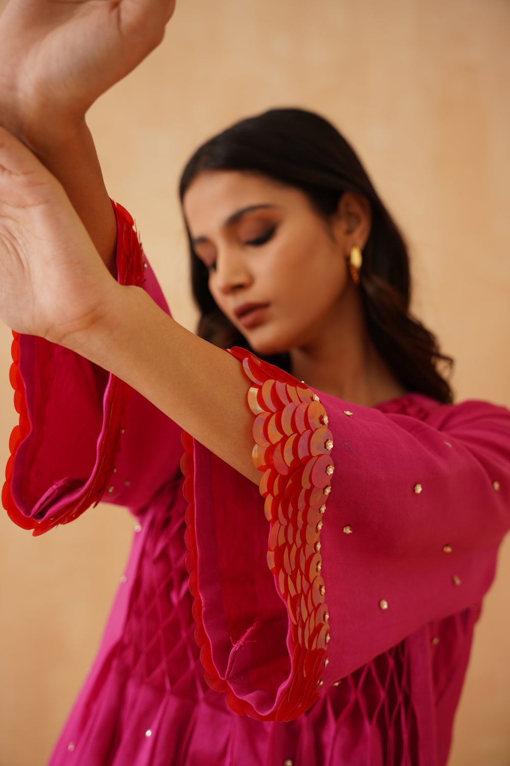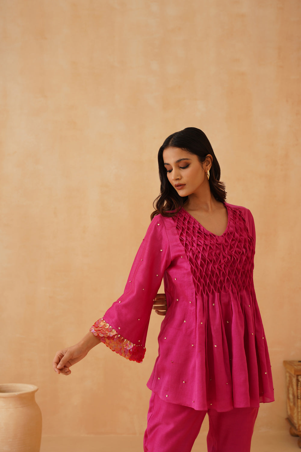 This coord set features honeycomb smocking on the front of the kurta. the sleeves are adorned with sequin embroidery at the hem, with chitta all over both the sleeves and kurta. the pants complement the ensemble with a 1” slit and potli buttons on the side.
