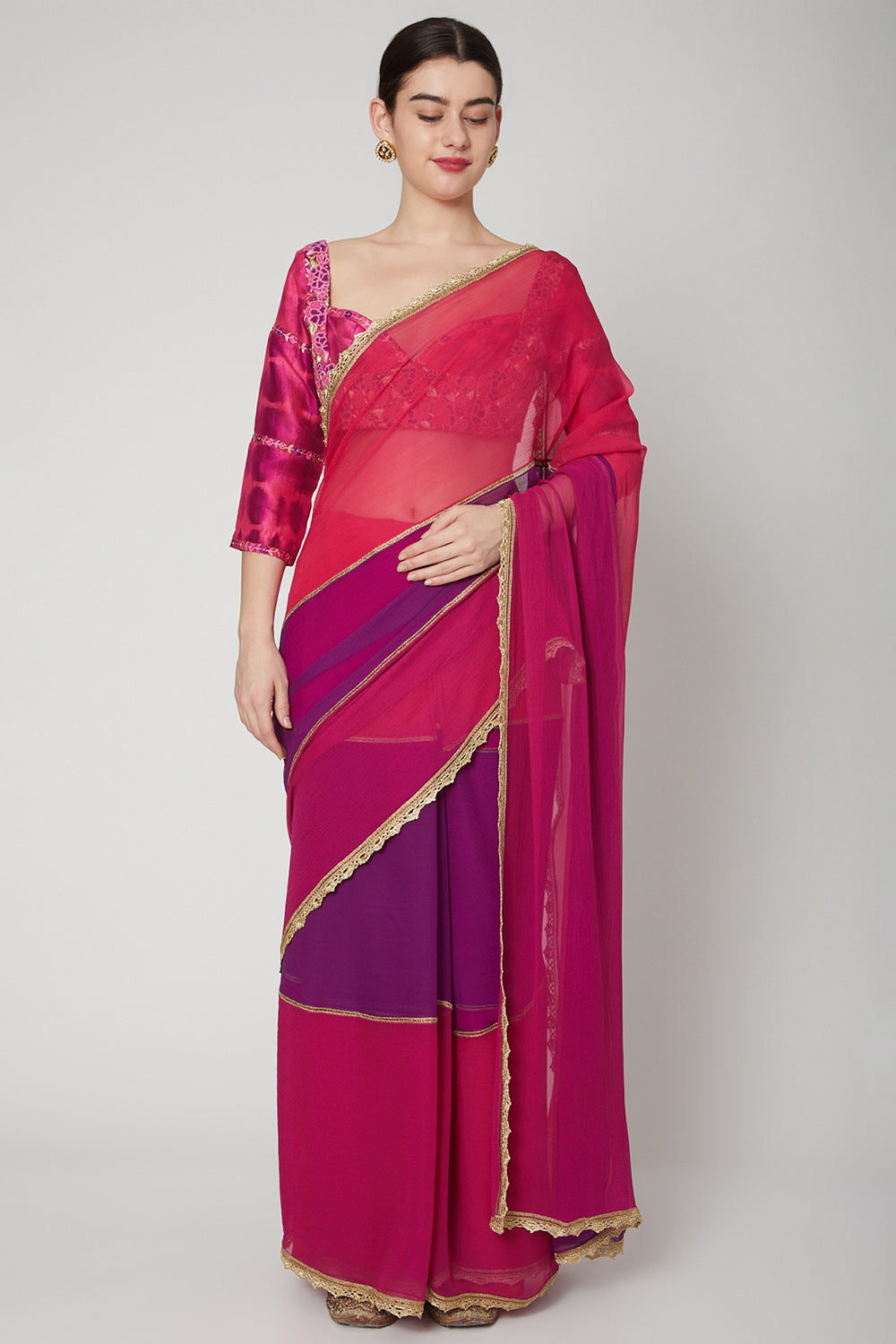 Colourblocked saree in pure chiffon,with crochet edges. Does not include blouse
