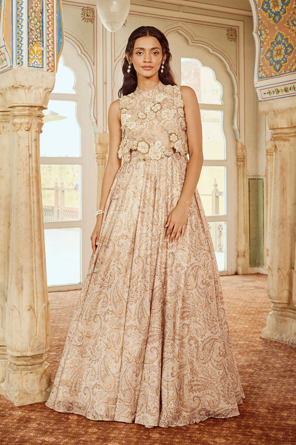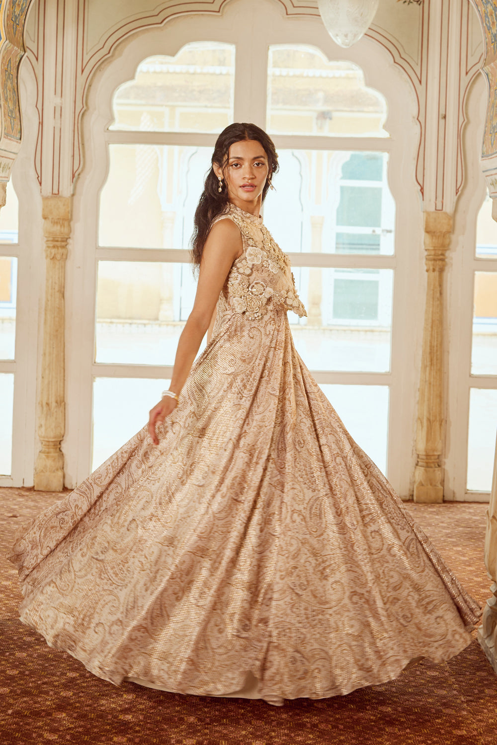 This beautiful ensemble features a full circular printed gown, with an embroided net flap.