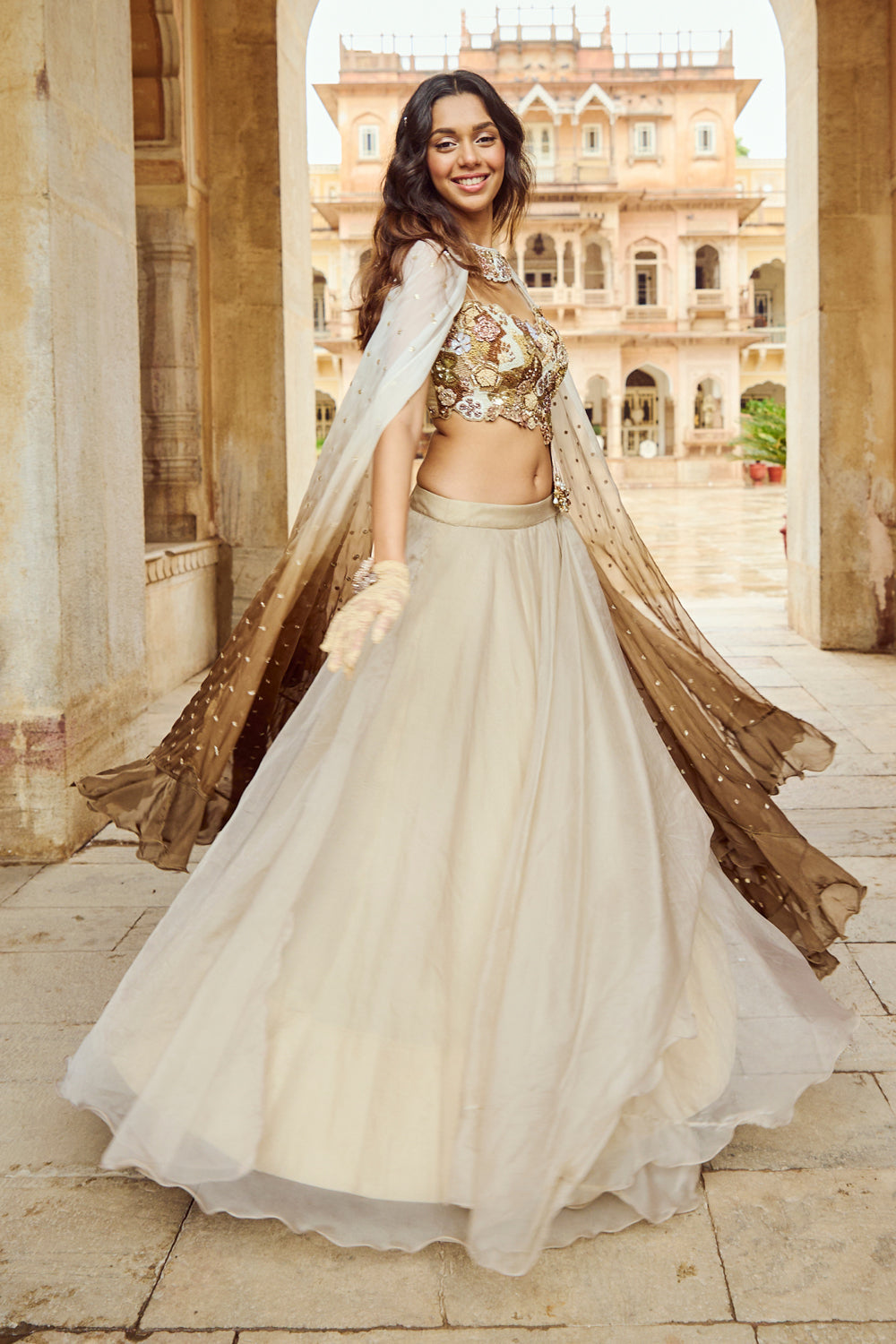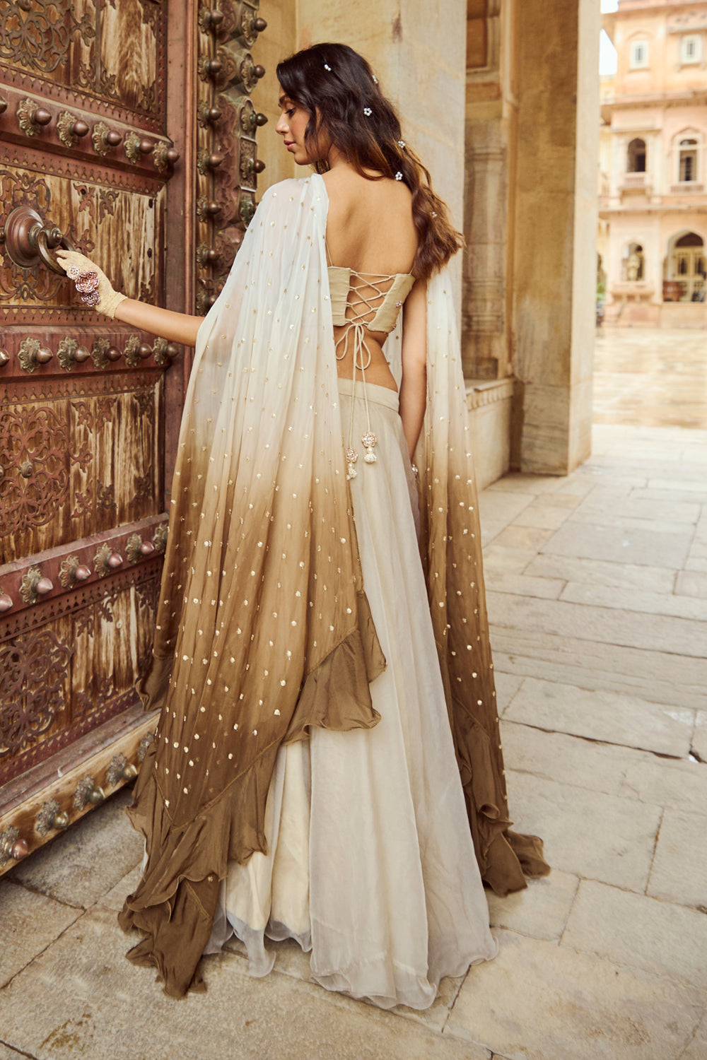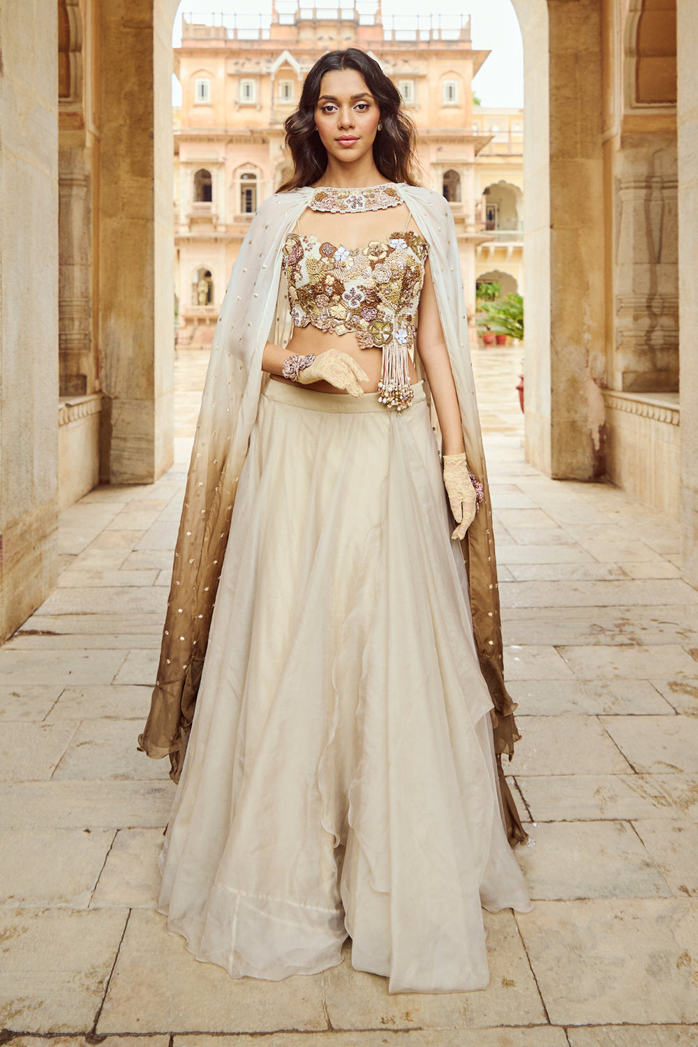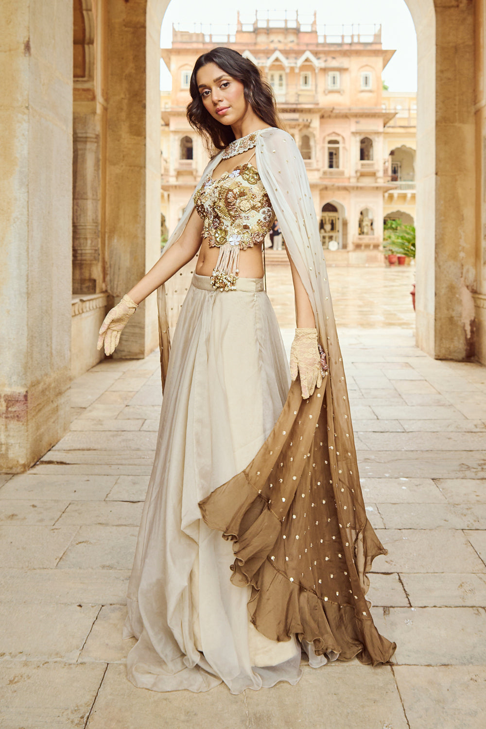 This beautiful ensemble features a modern silhouette, raw silk blouse adorned with intricate embroidery. it's paired with a simple yet elegant viscose organza skirt, along with an sequence organza ombre cape.