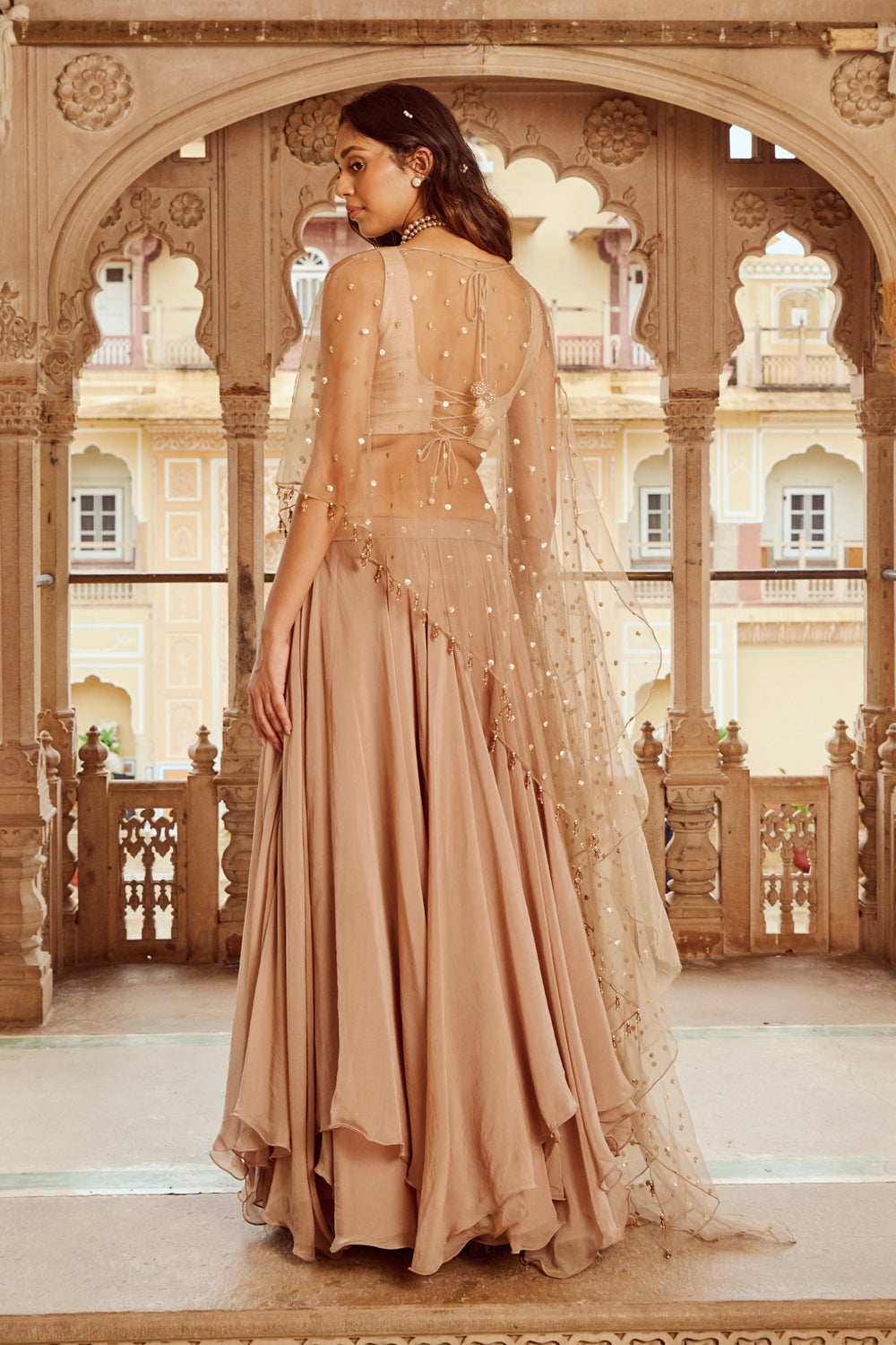 Fabric: Blouse- Raw silk Skirt- Viscose organza Dupatta- net sequin, net sequin(ruffles)