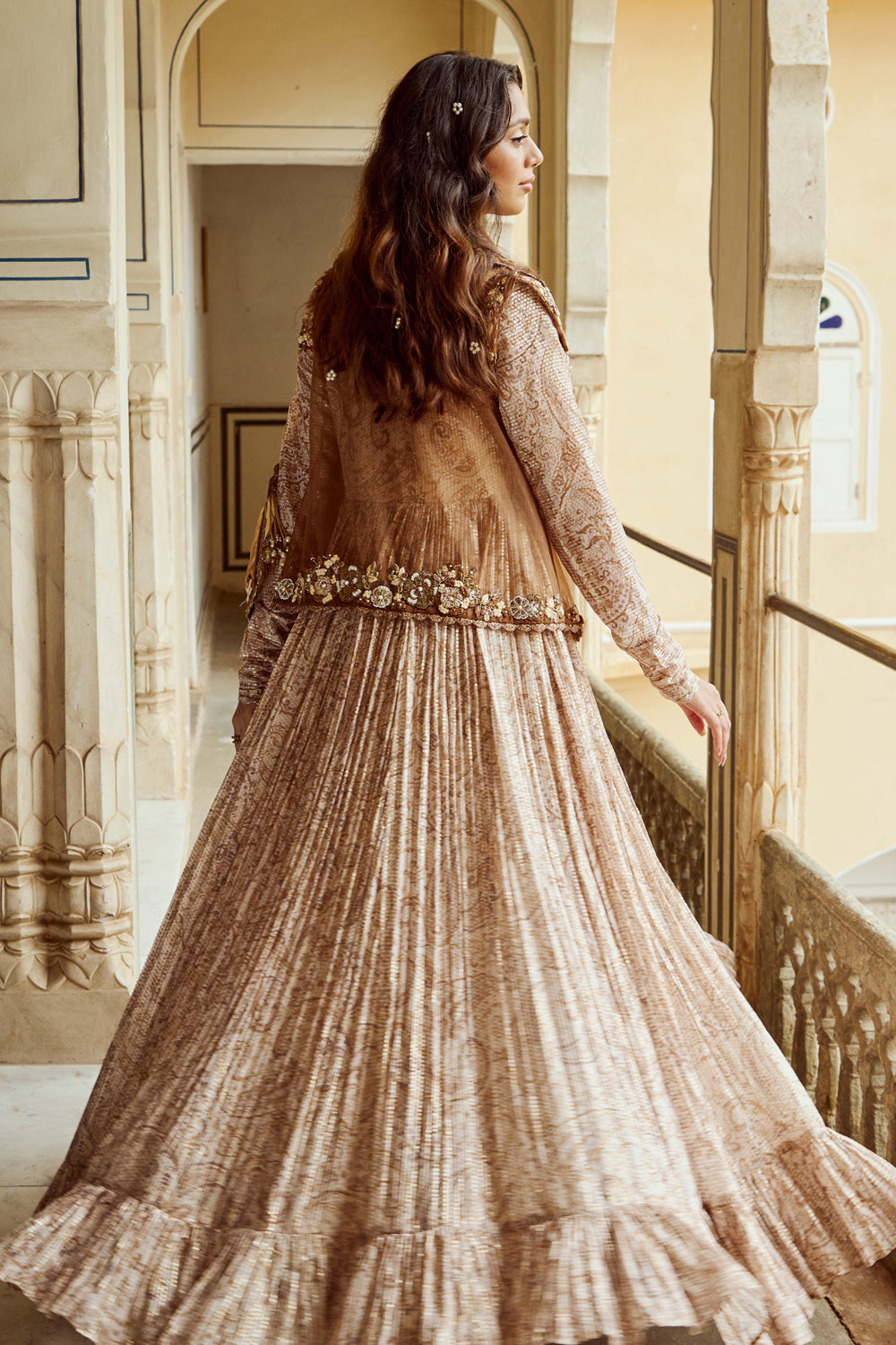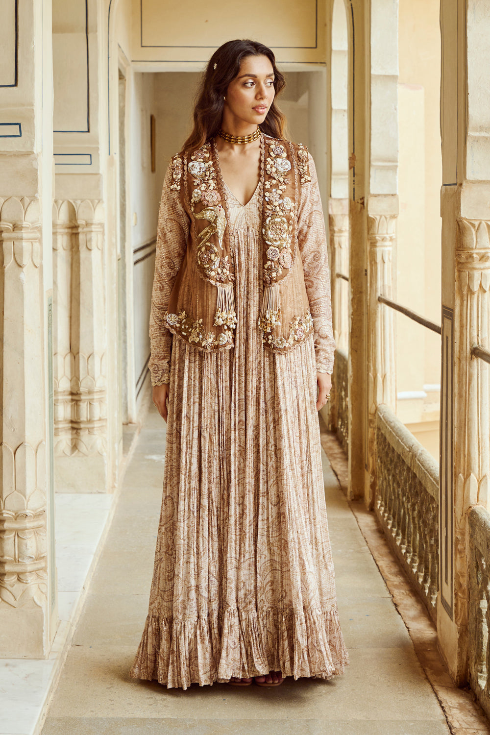 This printed ensemble features a gorgeous alia-cut maxi dress with gathered hem. it's paired with a sheer silk organza sleeveless jacket with a heavily embellished neckline and hem.