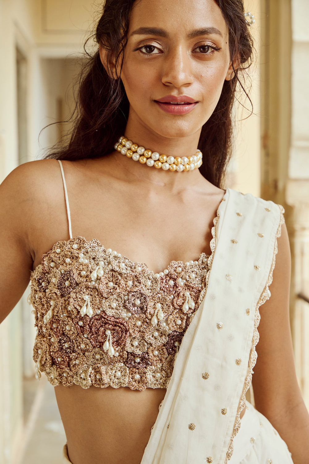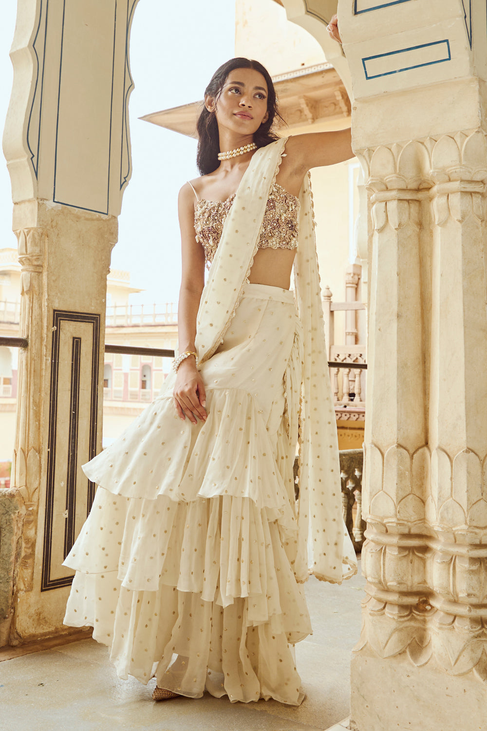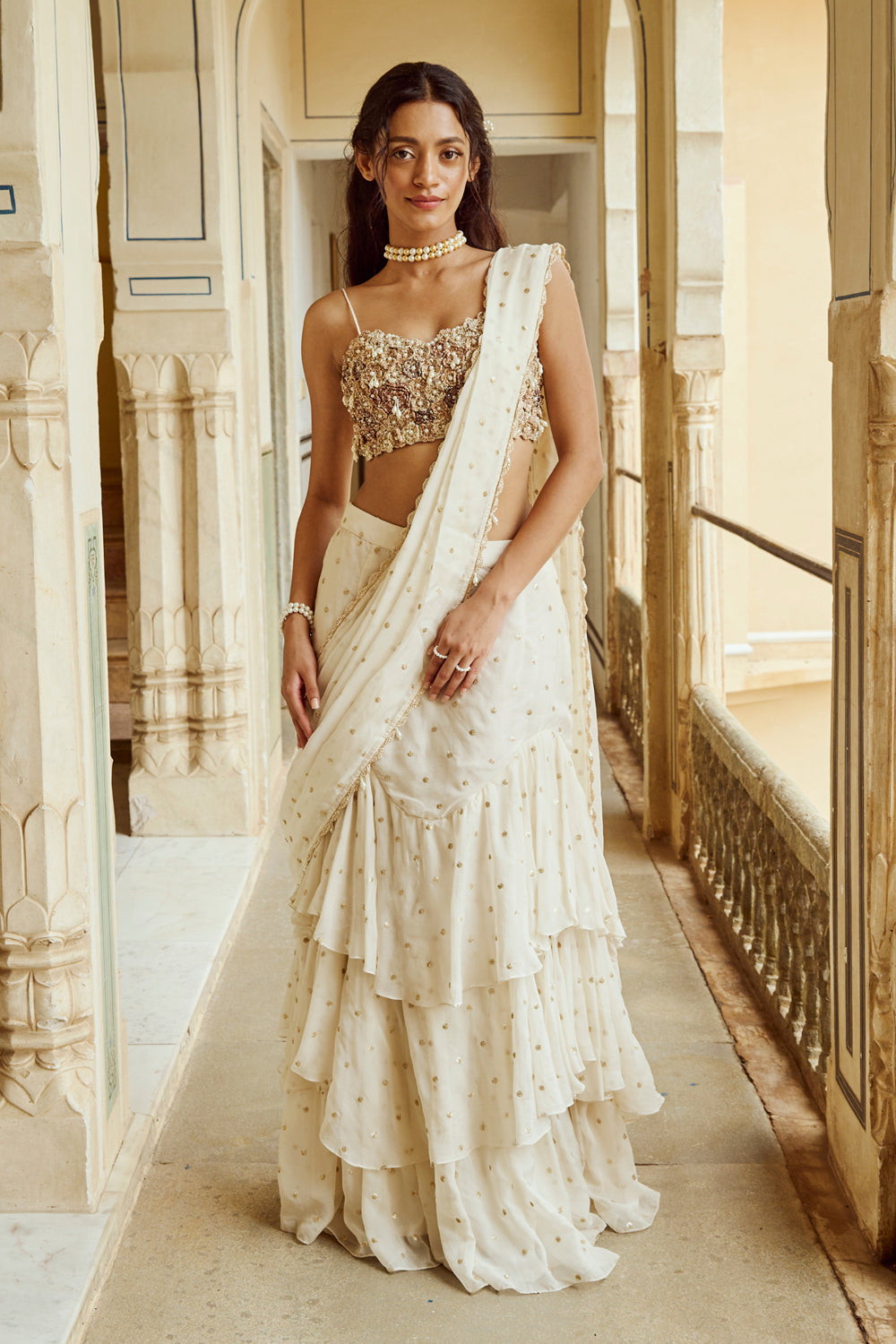This gorgeous ensemble features a mesh-flower embellished strappy blouse with a three tiered sequence organza saree.