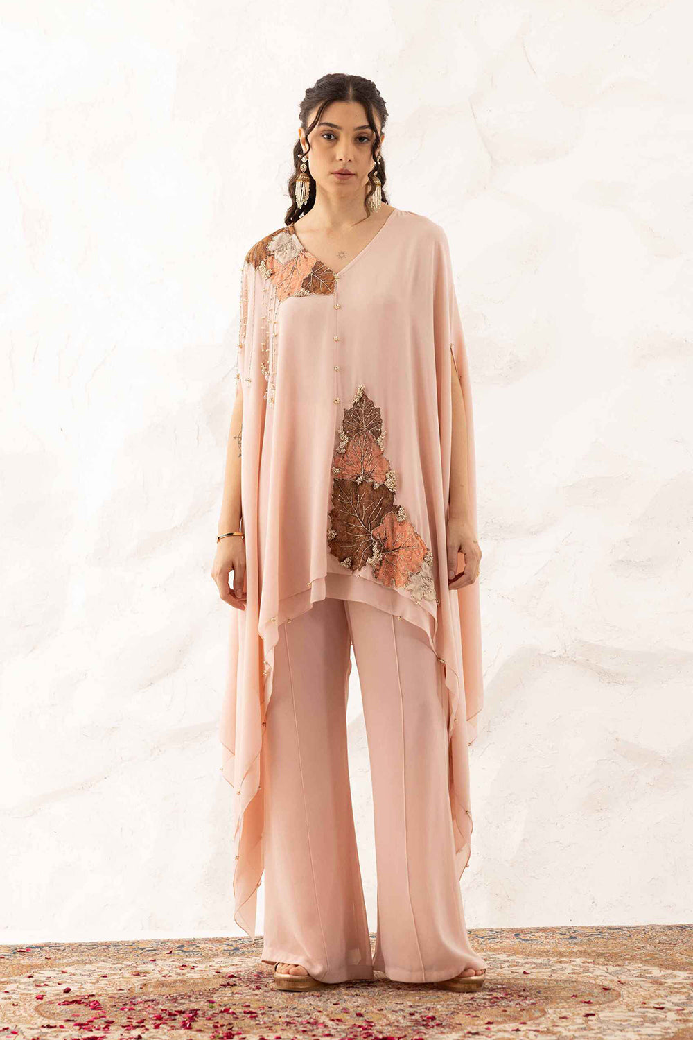 DOUBLE LAYER APPLIQUE EMBROIDERED NECKLINE CAPE PAIRED WITH FLARED PANTS