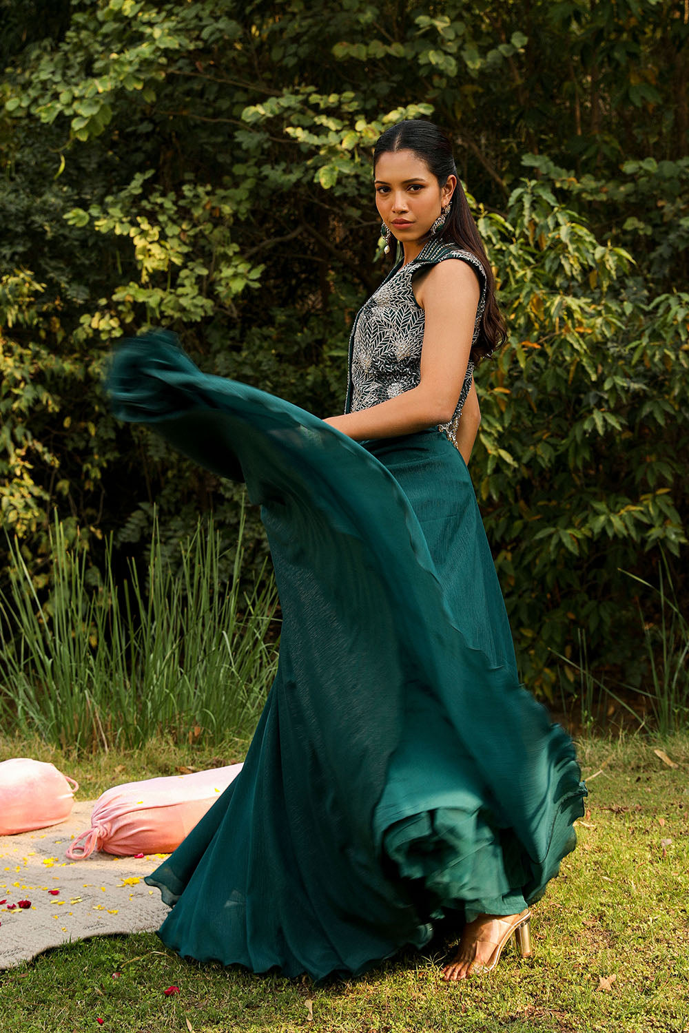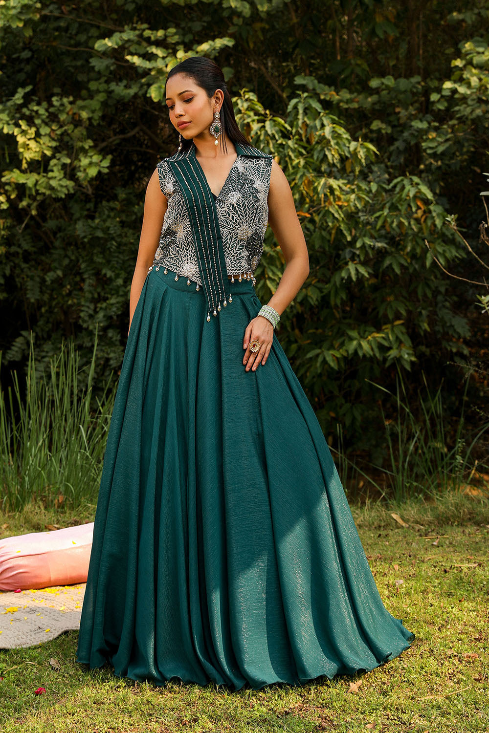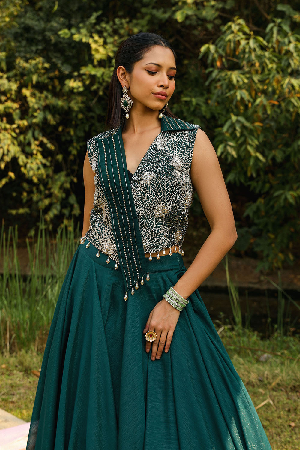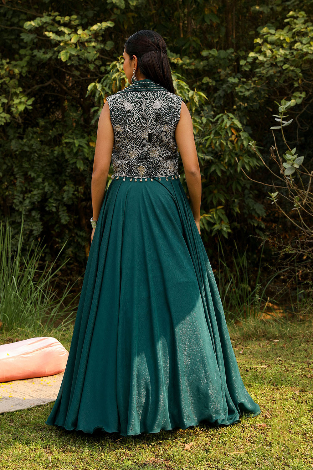 HEAVY EMBROIDERY PERAL BLOUSE WITH CAPE AND LEHNGA