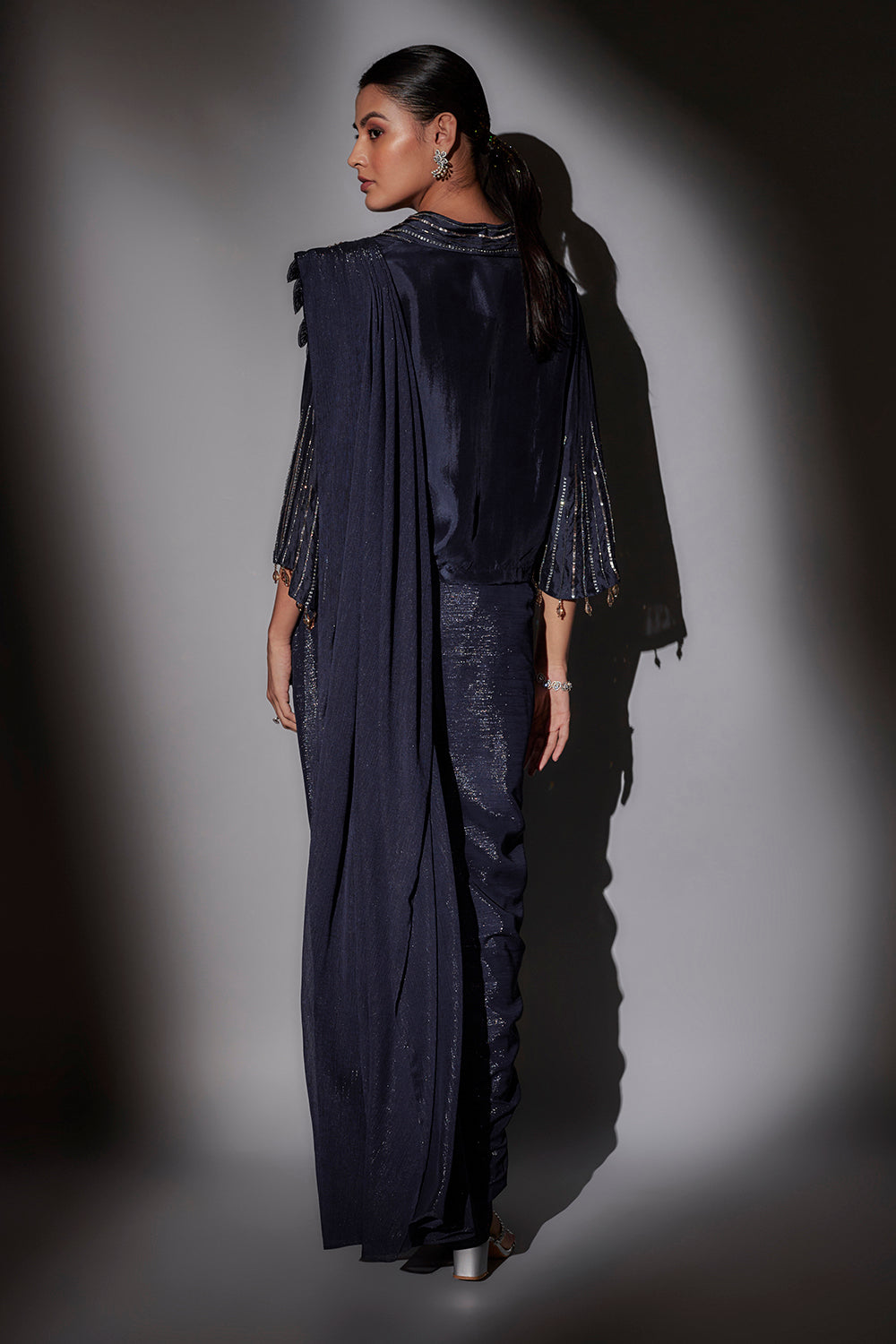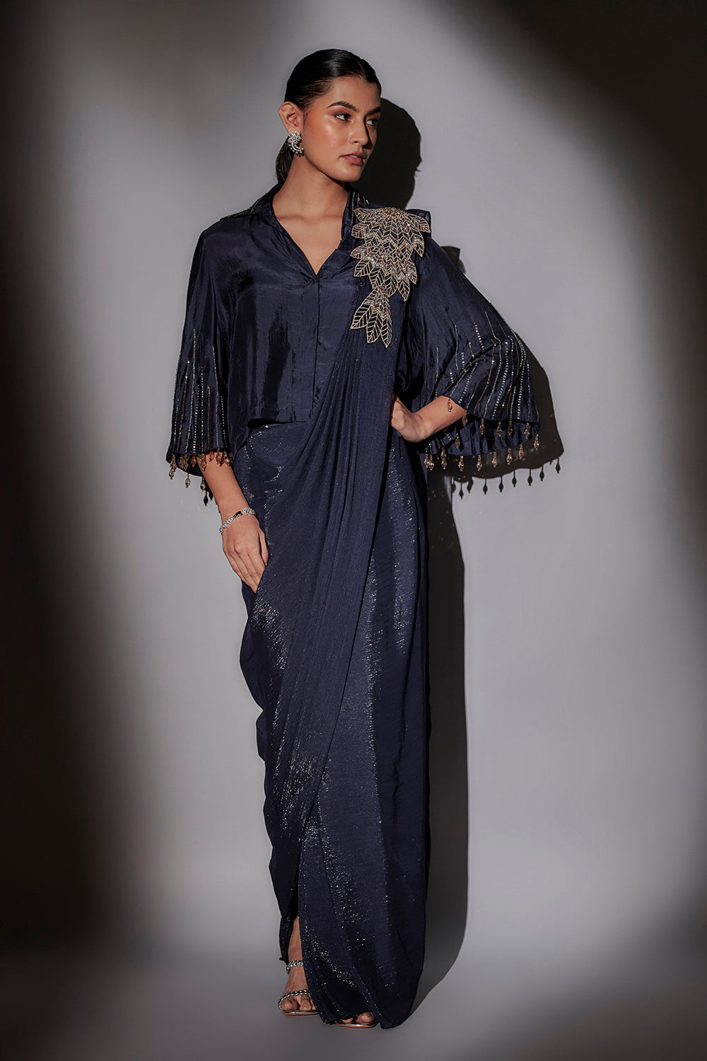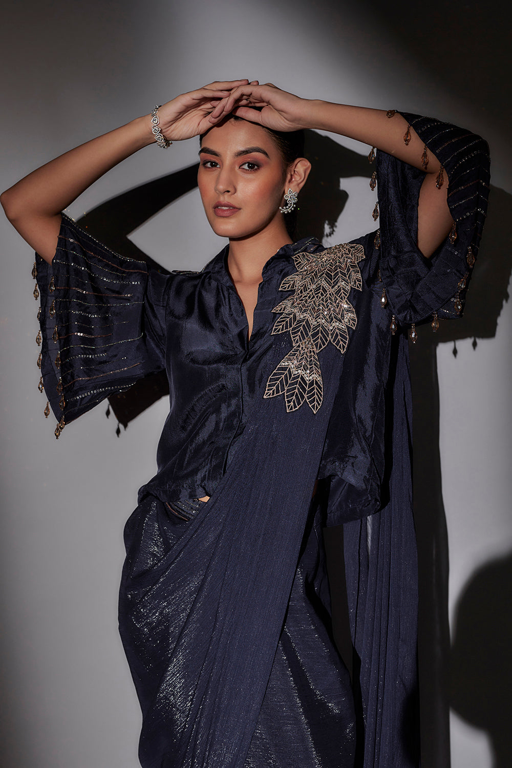 Bohemian Inspired Shirt Blouse With Bell Sleeves Paired With Pre Draped Saree