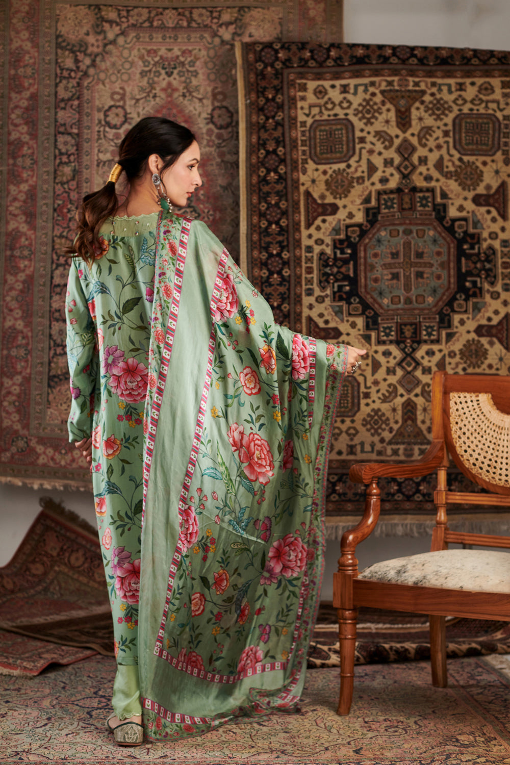 Featuring mint green kurta set is adorned with intricate hand embroidery on flattering v-neckline. paired with scalloped edge cotton silk pants and a digital printed silk dupatta, this set exudes elegance and sophistication. elevate your wardrobe with this versatile and stylish ensemble.