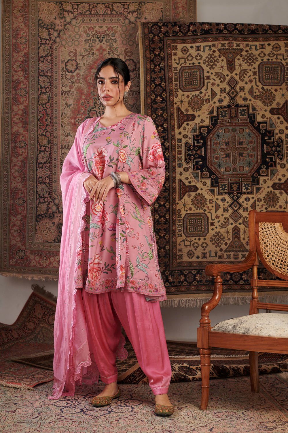 Chintz old rose kurta set exudes elegance and grace. the short anarkali style kurta features bell sleeves for added flair, while the modal salwar provides comfort and ease of movement. the hand embroidered chanderi dupatta adds a touch of sophistication with its attached embroidered organza edges. elevate your wardrobe with this stunning ensemble.