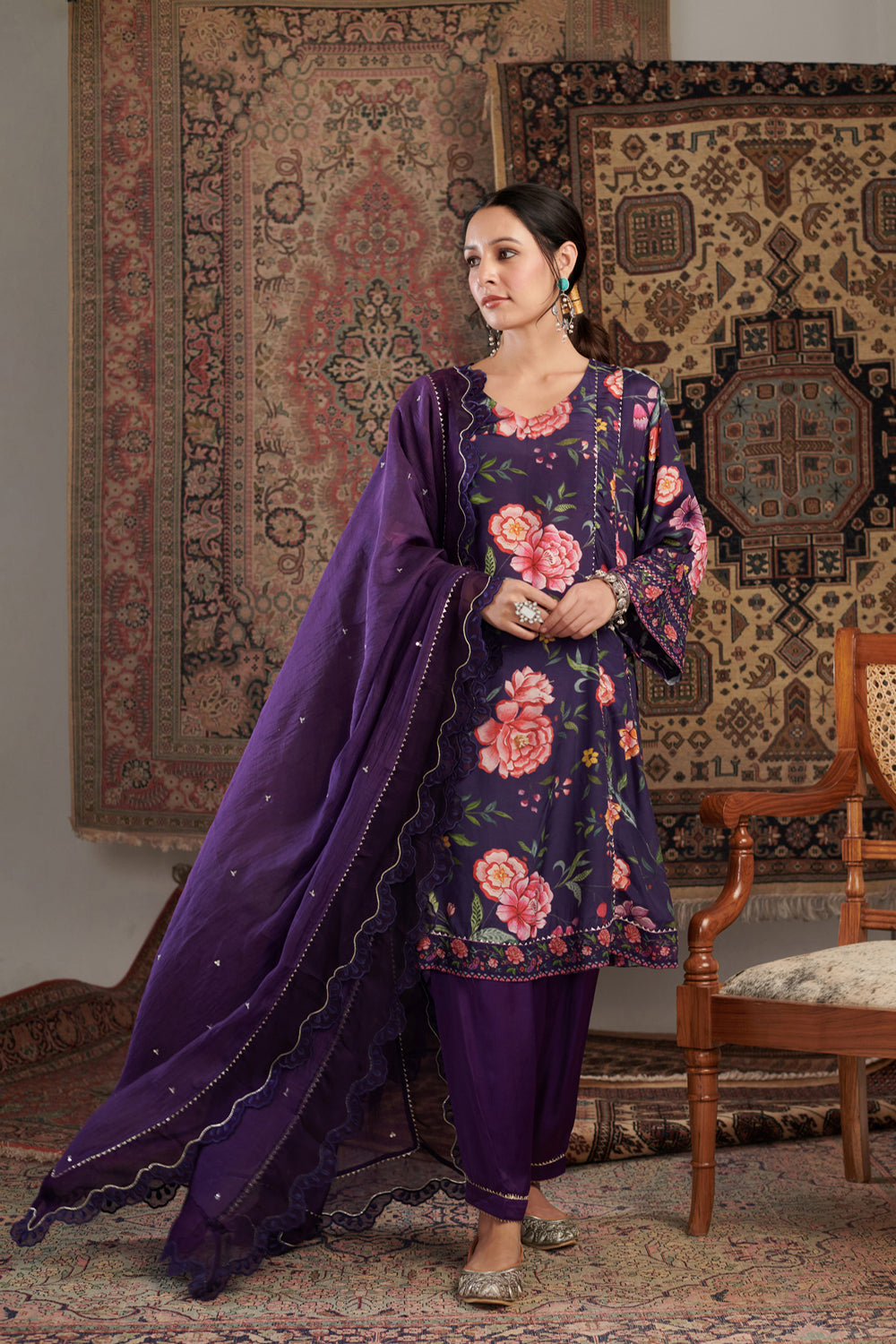 Chintz purple kurta set exudes elegance and grace. the short anarkali style kurta features bell sleeves for added flair, while the modal salwar provides comfort and ease of movement. the hand embroidered chanderi dupatta adds a touch of sophistication with its attached embroidered organza edges. elevate your wardrobe with this stunning ensemble.