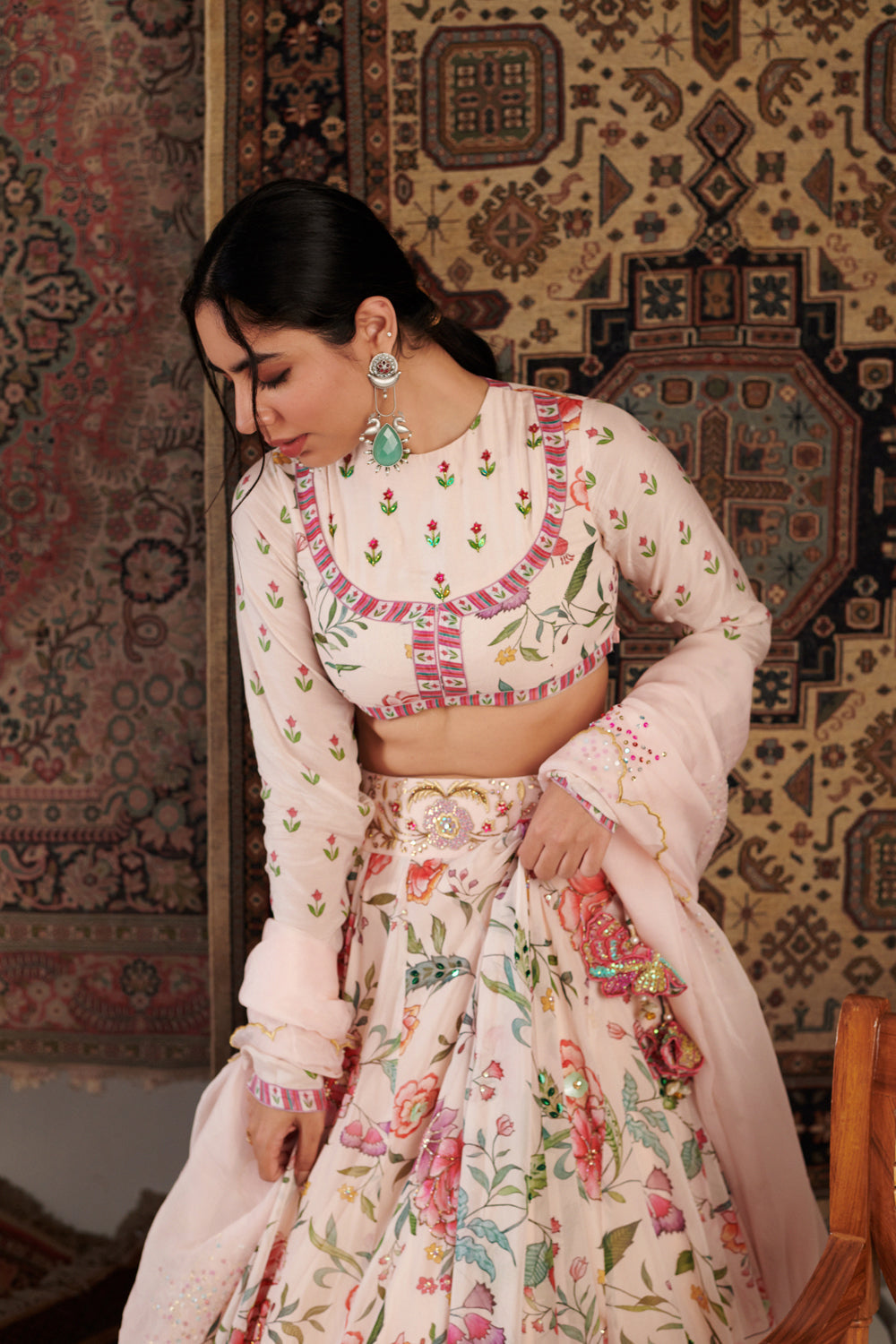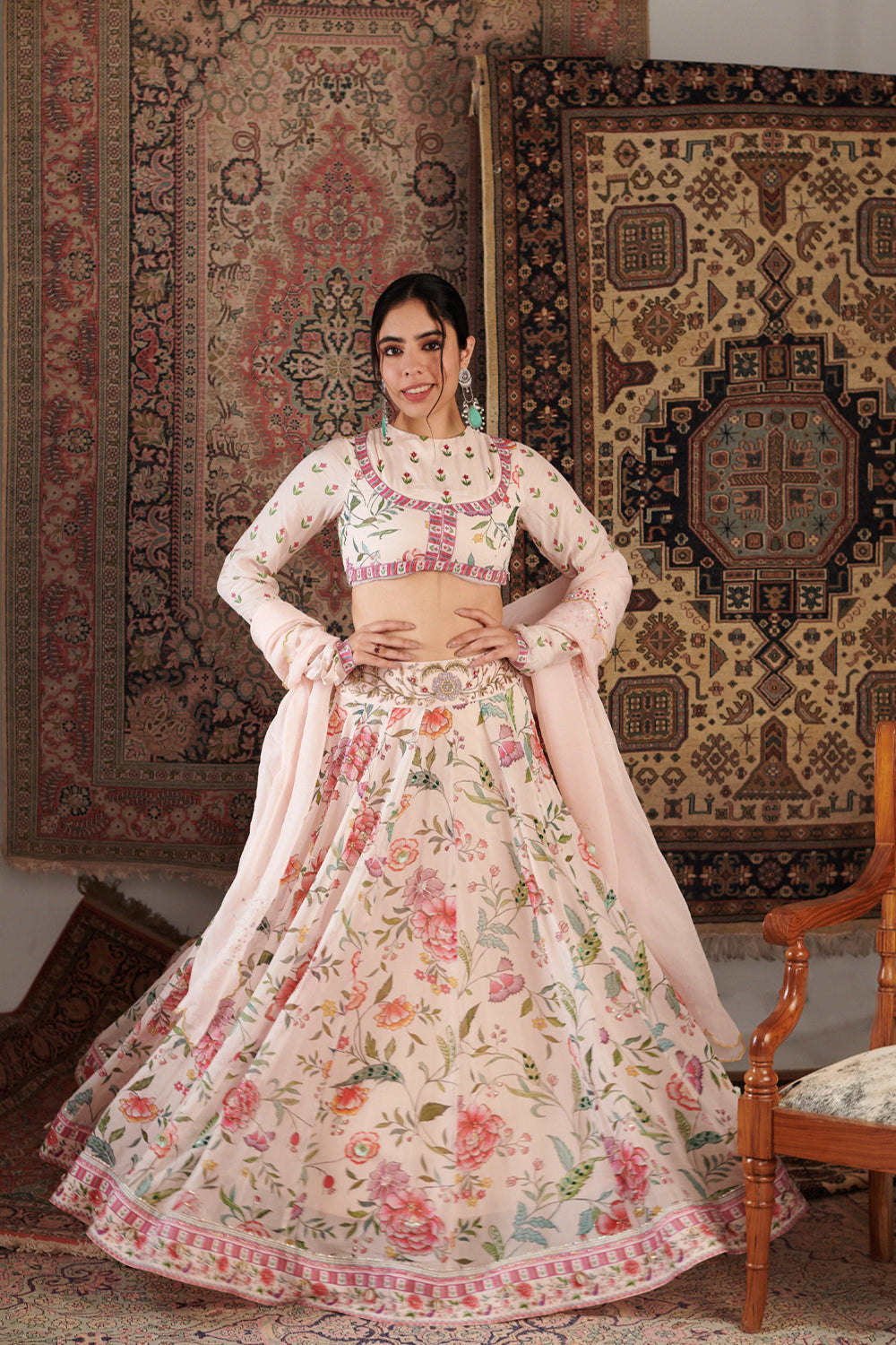 Featuring ivory lehenaga set features exquisite hand embroidery and swarovski stone detailing, while the blouse and organza dupatta boast delicate handwork and elegant scalloped edges. elevate any occasion with this timeless and sophisticated ensemble.
