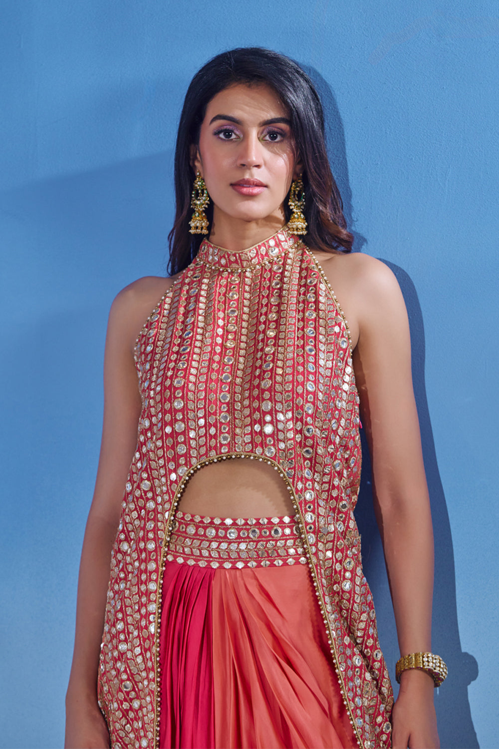 Featuring peach ombre & red zari & patra biker jacket with pant in geogette