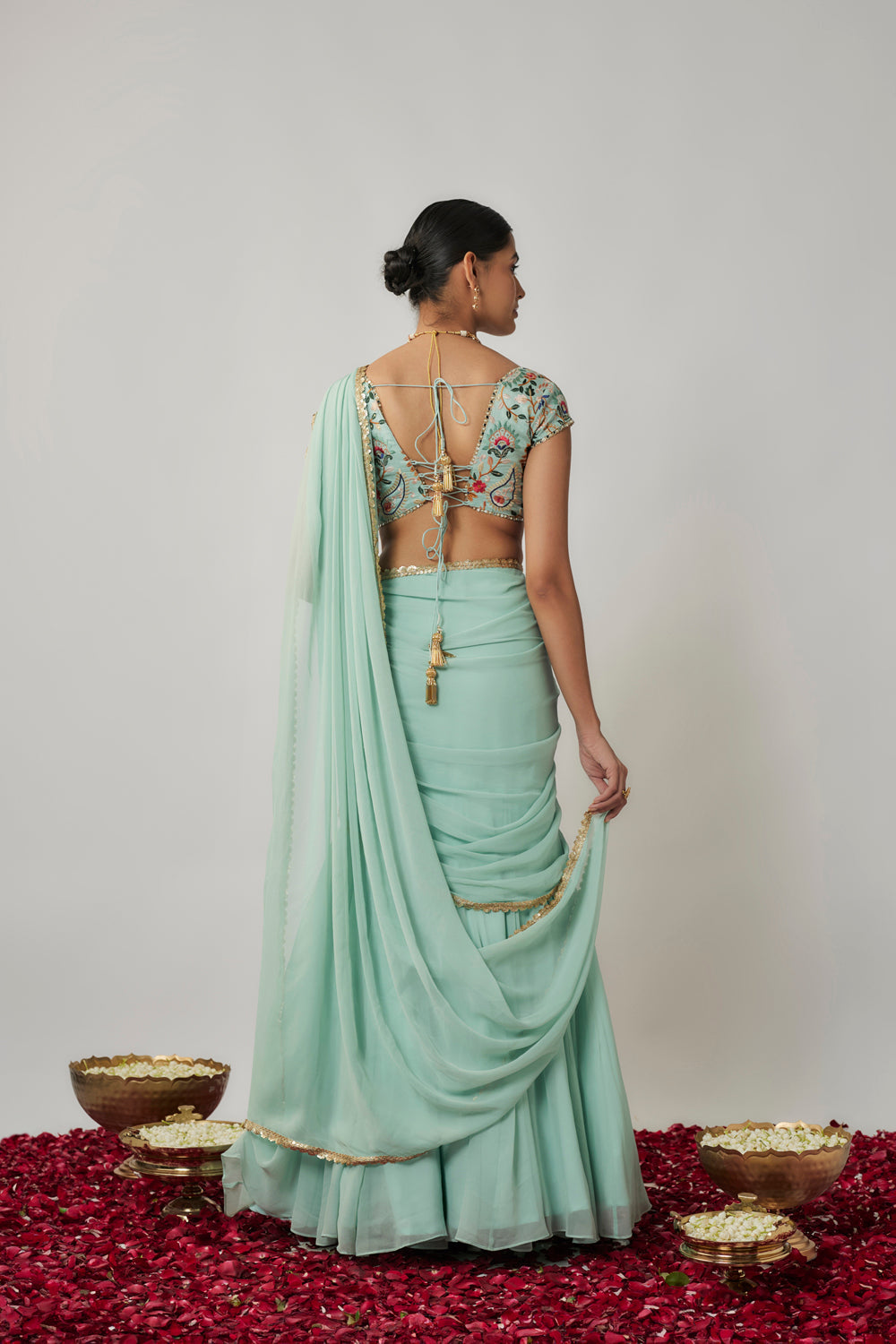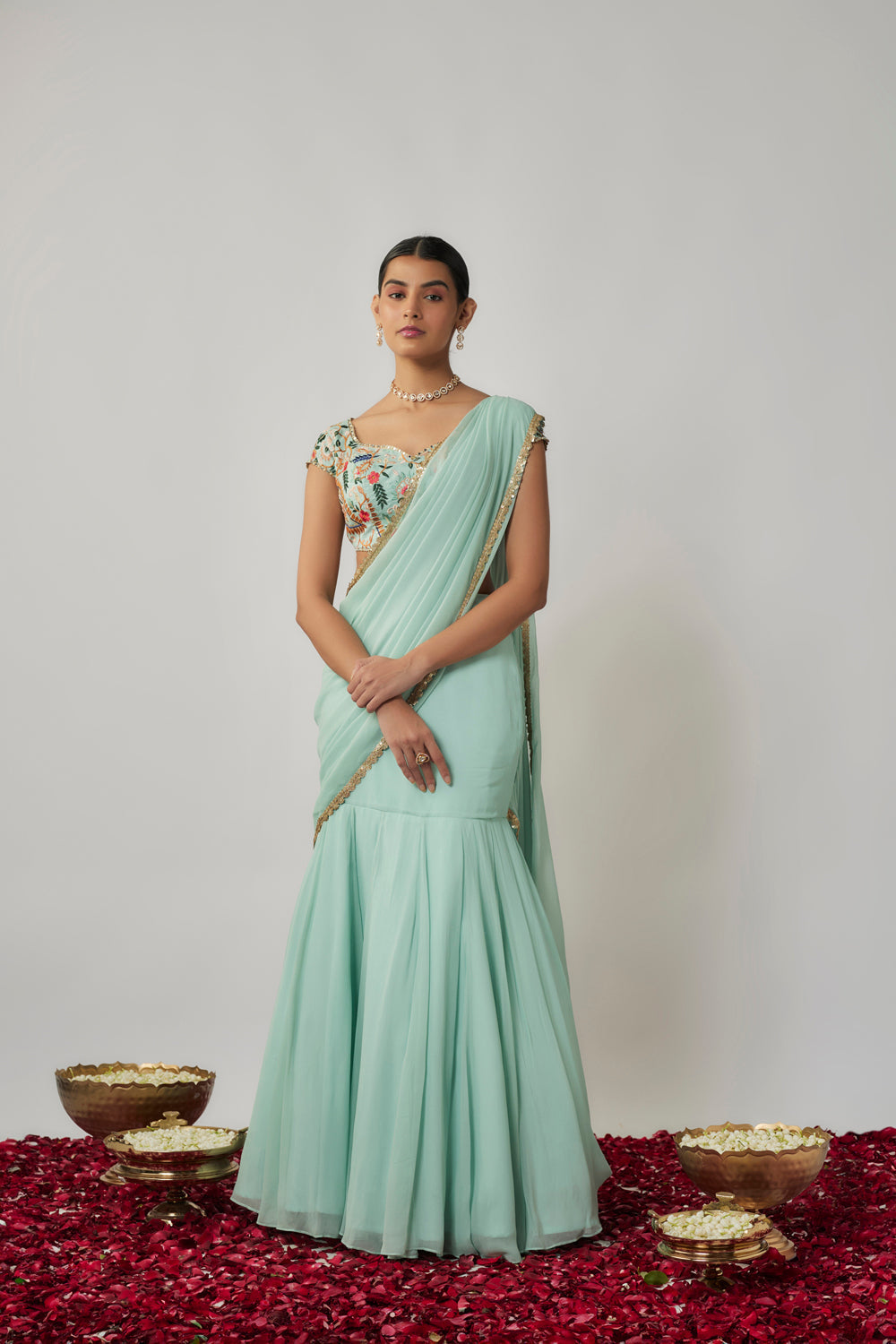 This look features a mint short sleeves silk blouse, with multicolour floral threadwork. it is teamed with a stitched, fish cut georgette skirt with attached saree palla drape. the drape is embellished with a delicate gold sequin border, ready and easy to wear saree set.