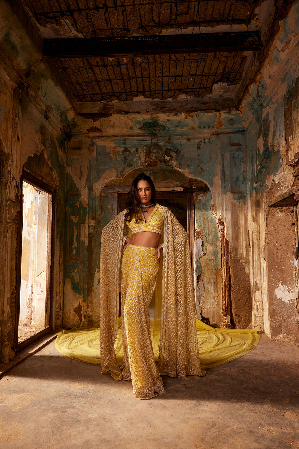 Yellow Net Embroidered Blouse, Saree Skirt With Long Pallu Dupatta