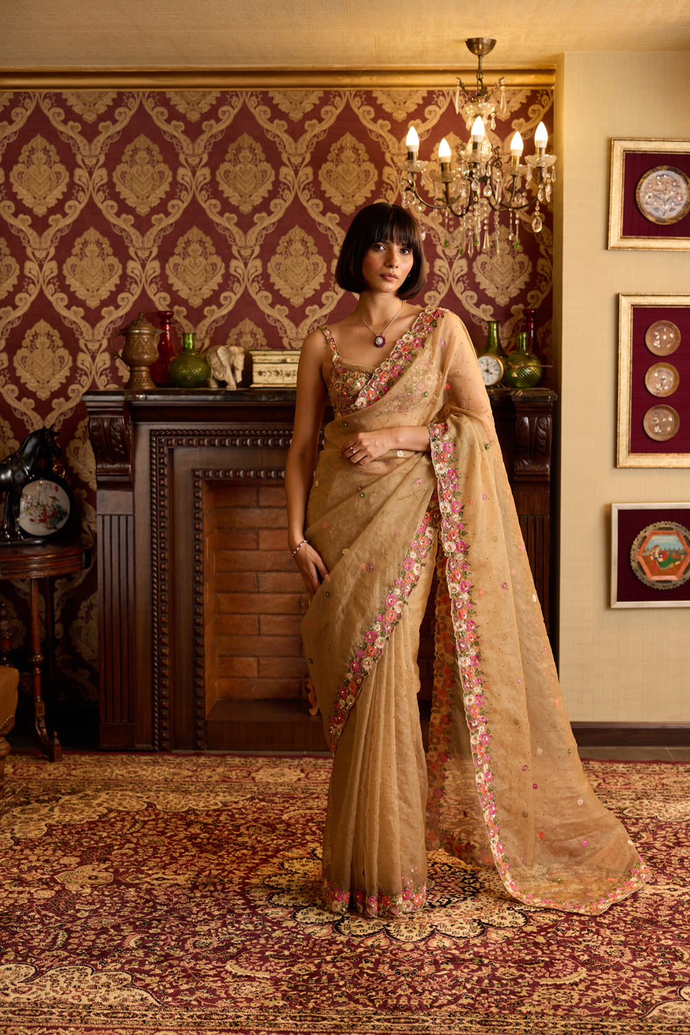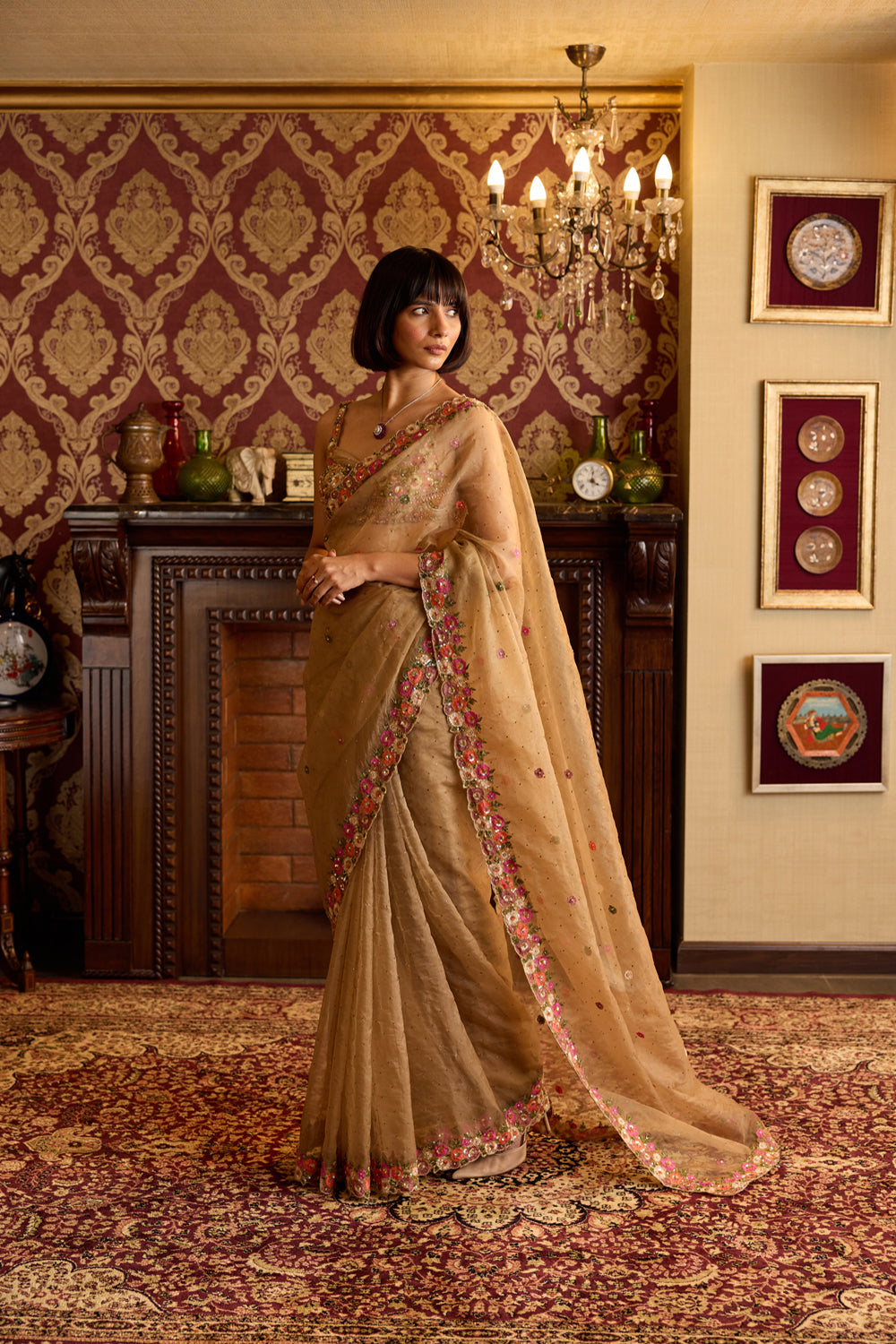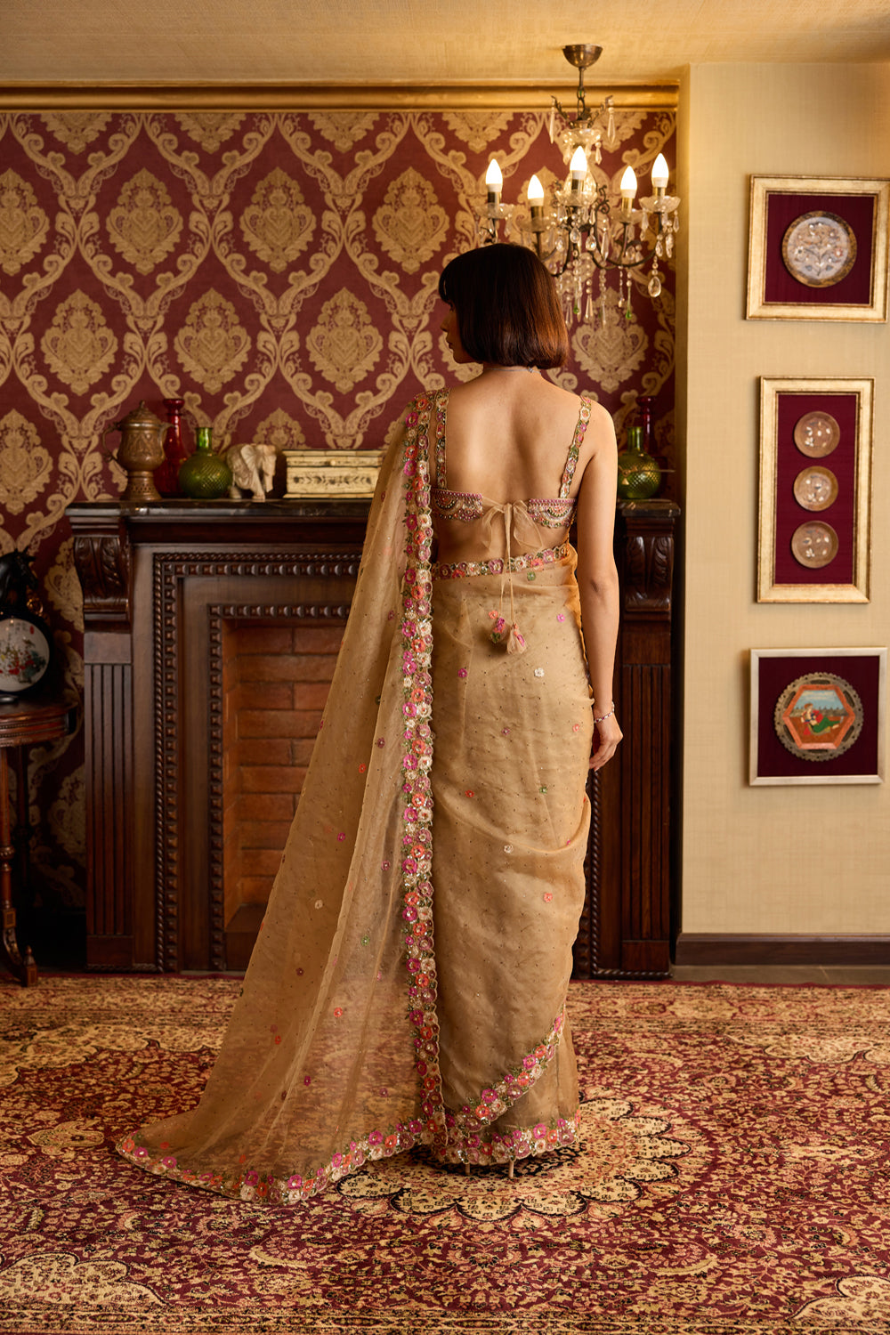 Delicate organza sari, adorned with a vibrant multicolour floral cutwork border. paired with a matching multi-coloured floral blouse featuring a unique tying back detail, this ensemble is enhanced with intricate resham zardozi and sparkling sequins