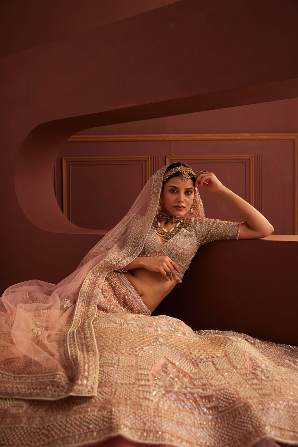 Inspired by the architectural wonders of the mughal dynasty, the lehanga features a stunning combination of zari dori work and two-toned bead embellishments. adorned with delicate cutdaana and sparkling sequins