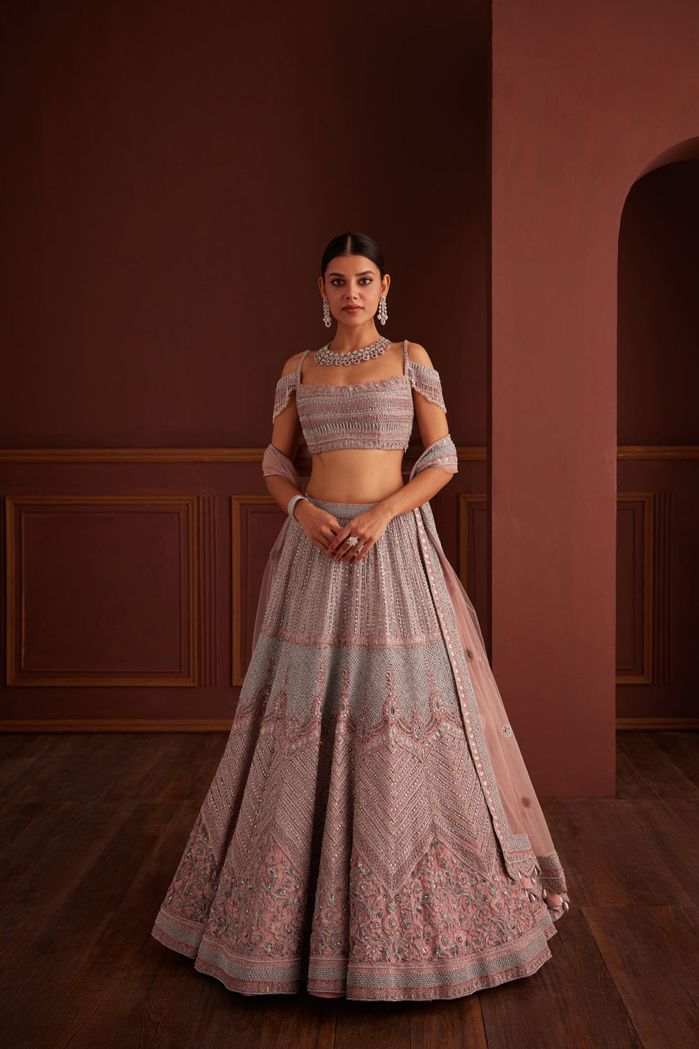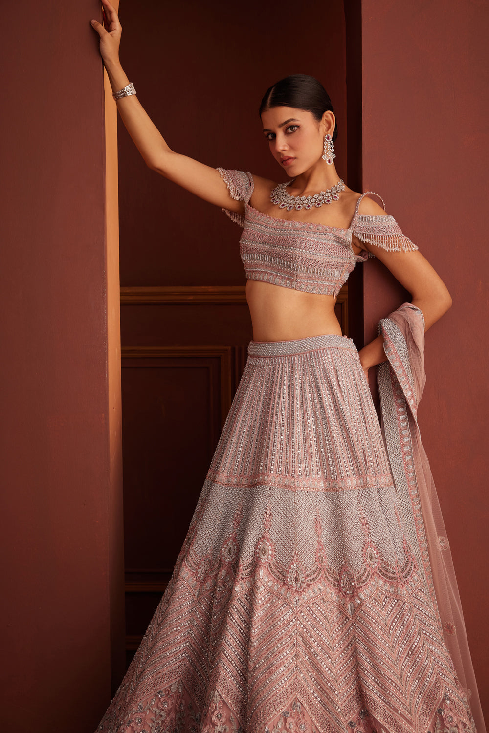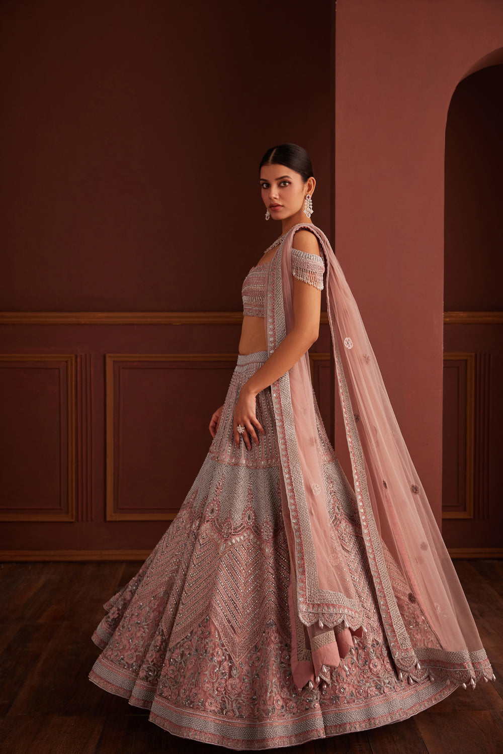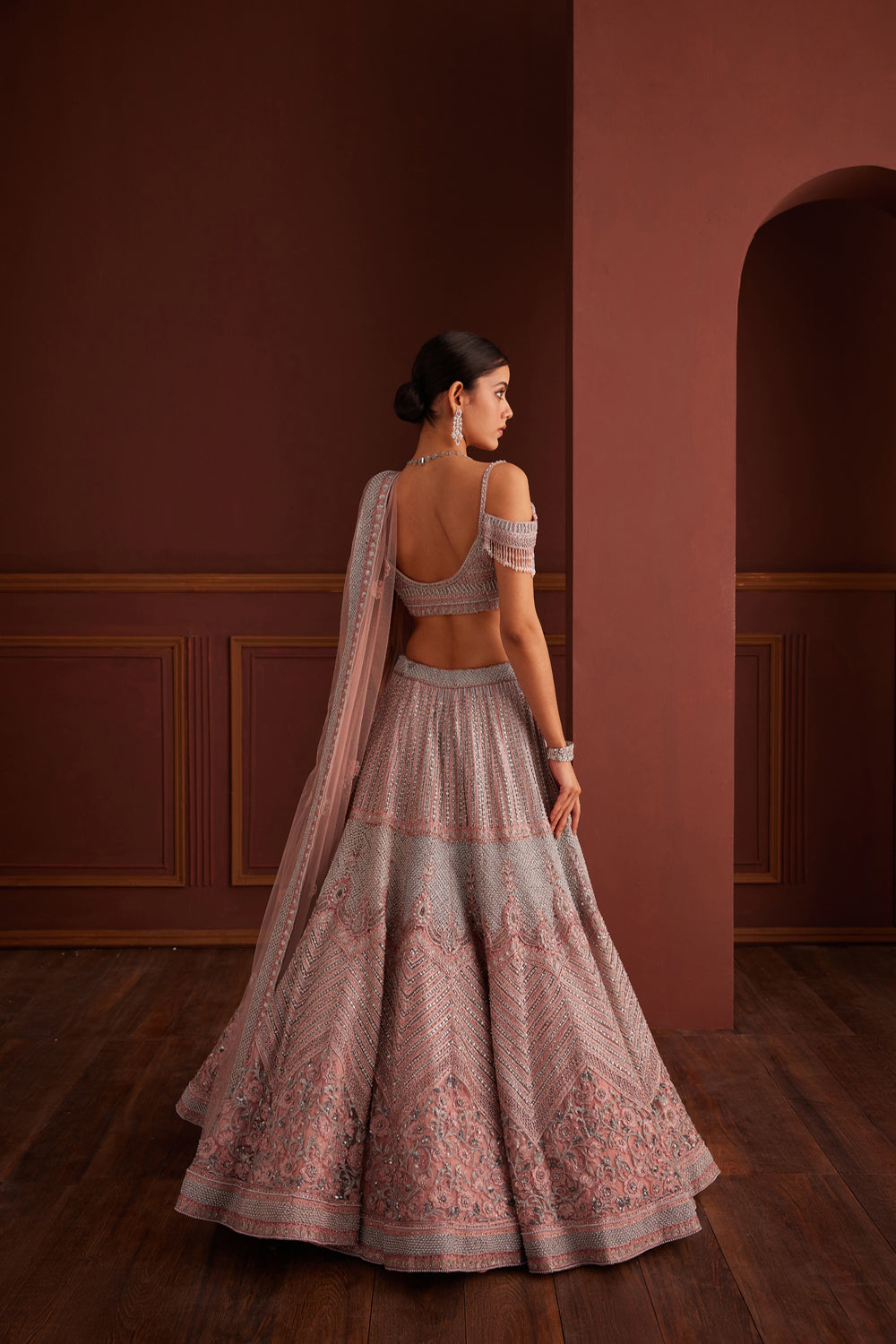 The extensively flared silhouette combines hues of greys and pinks, adorned with antique silver zari dori, beads, cutdaana, sequins, and delicate crystal drops. intricately finished with mesh-look embroidery