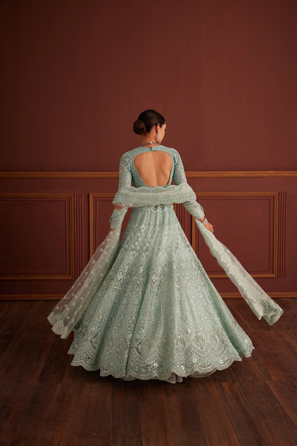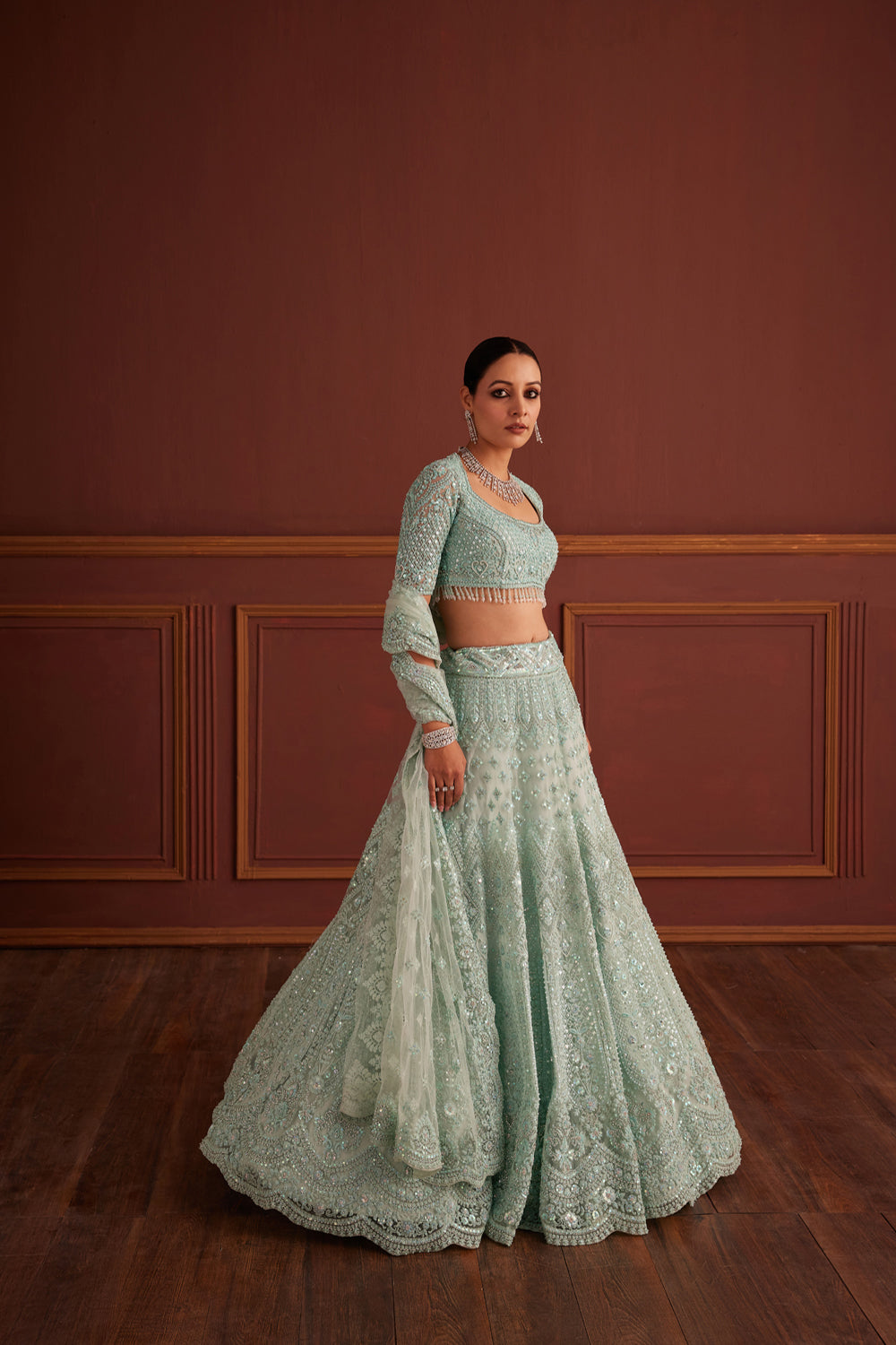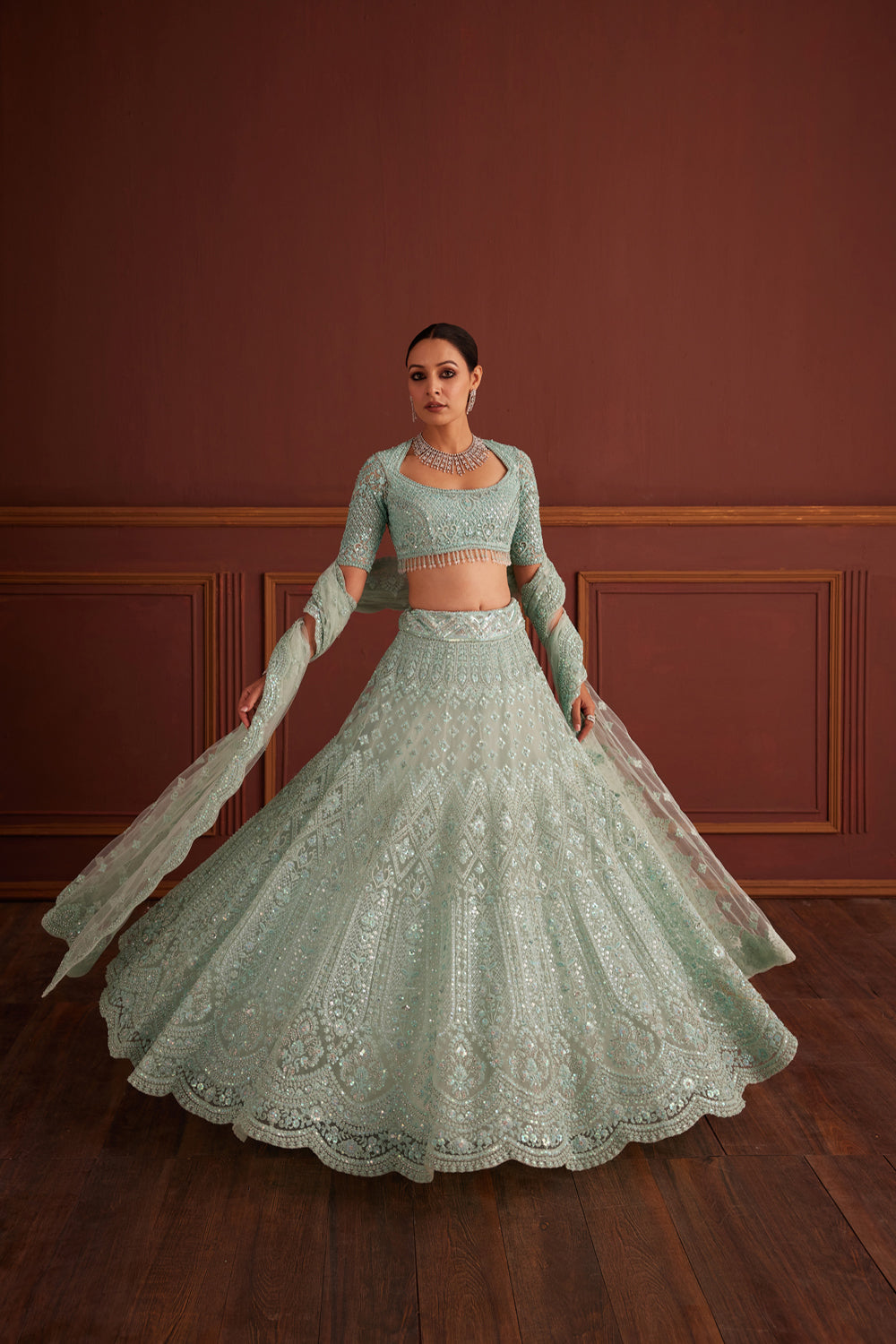 Tone-on-tone wide flared lehanga ensemble. adorned with matching resham dori work, intricate sequins, cutdaana, and delicate beads, this ensemble exudes grace and sophistication. complete with a scalloped lehanga and a matching scalloped dupatta