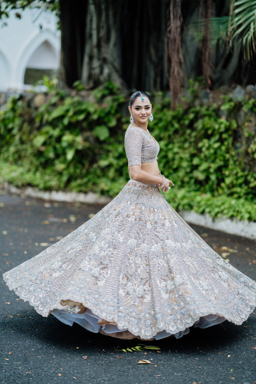 A champagne gold extensively flared scalloped lehenga. adorned with intricate antique zari work, dabka, cutdaana, sequins, and beadwork in mughal-inspired motifs, it exudes regal charm and timeless elegance. complete with a matching scalloped dupatta