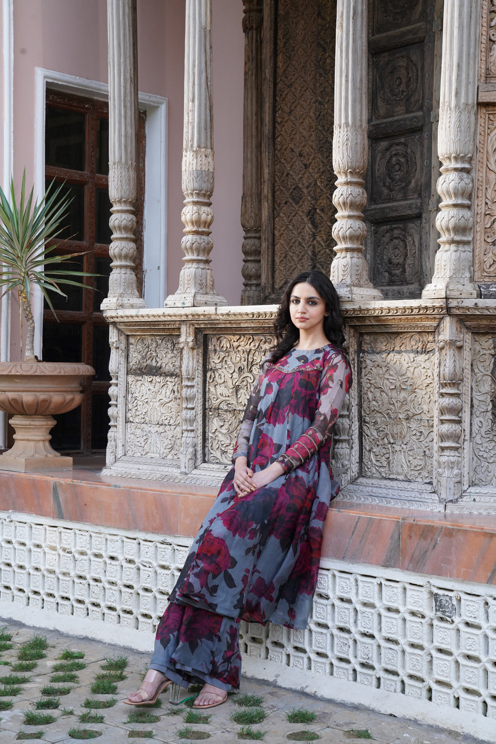 Light grey floral a line kurti set