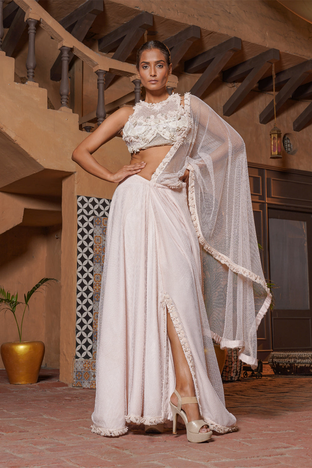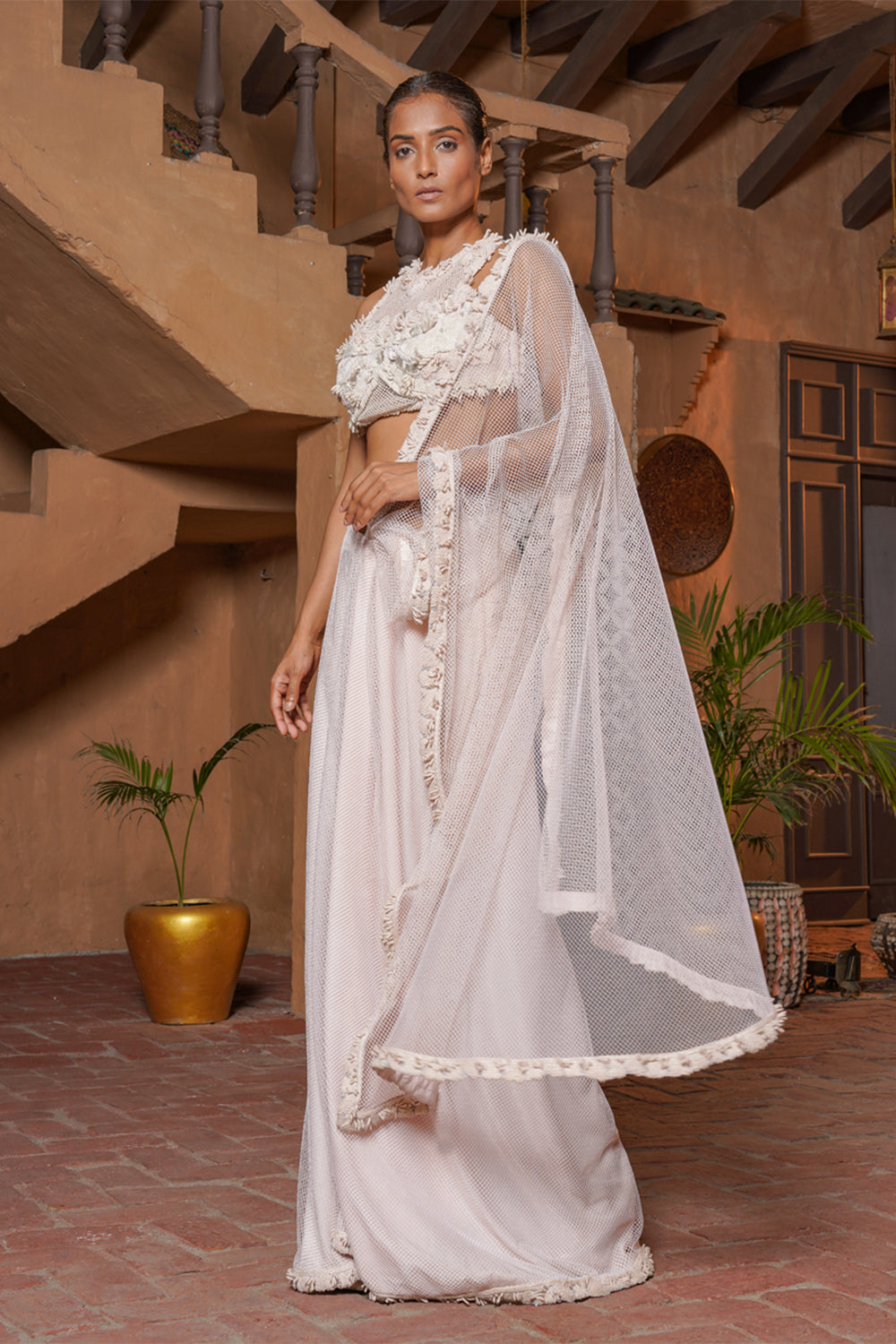Featuring drape saree embellished with embroidery paired with our signature embroided bodice