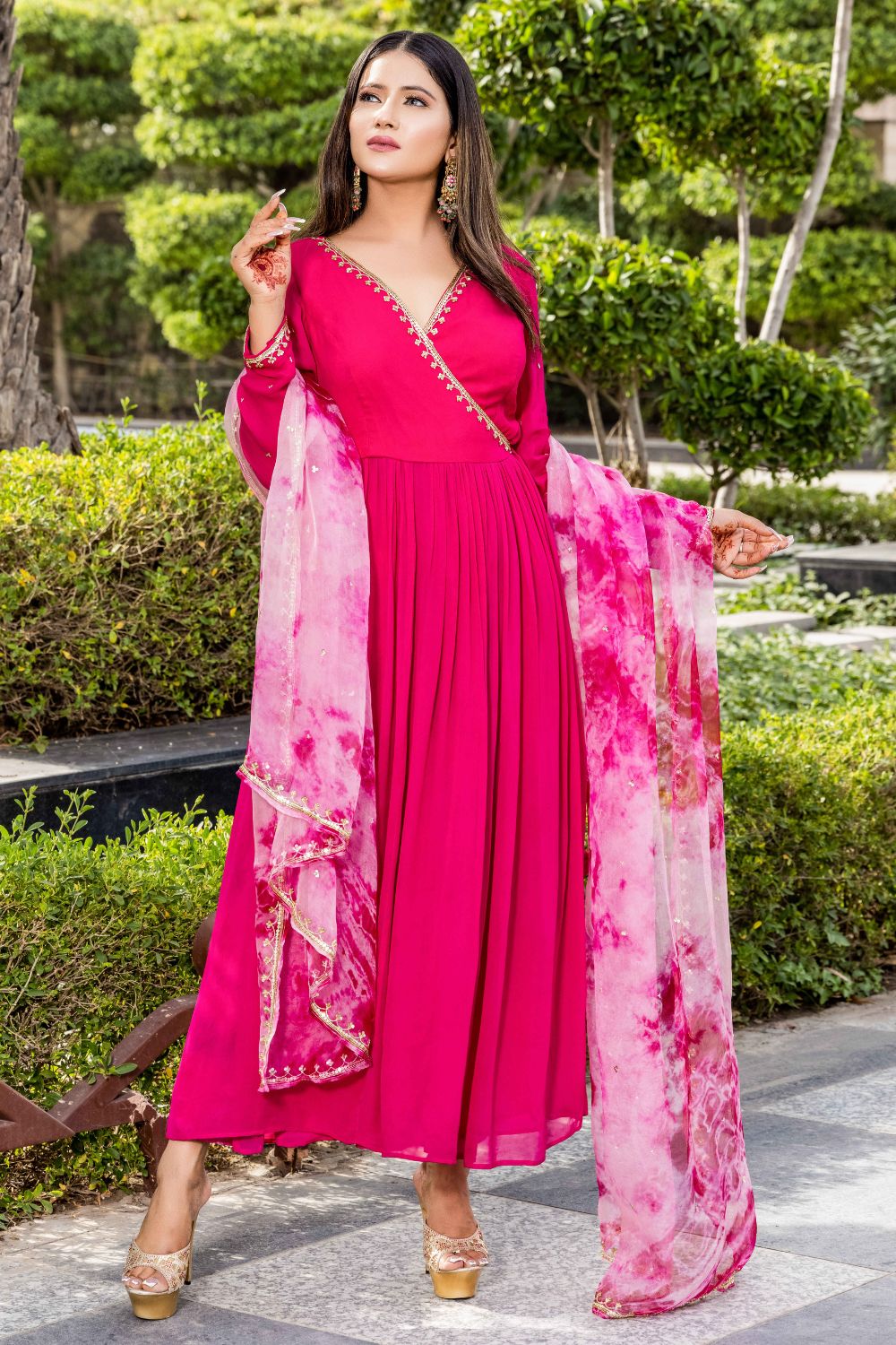 Angana - Rani Pink Angrakha Suit With Tie And Dye Dupatta