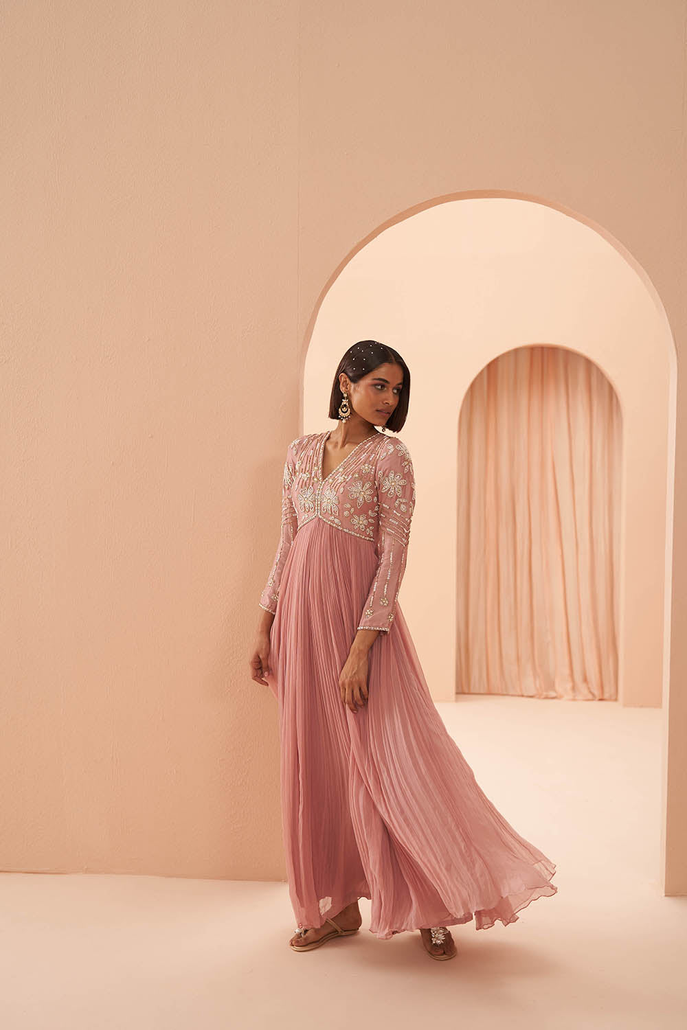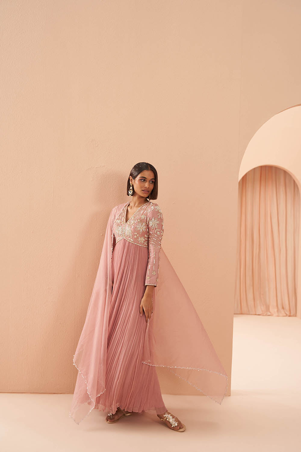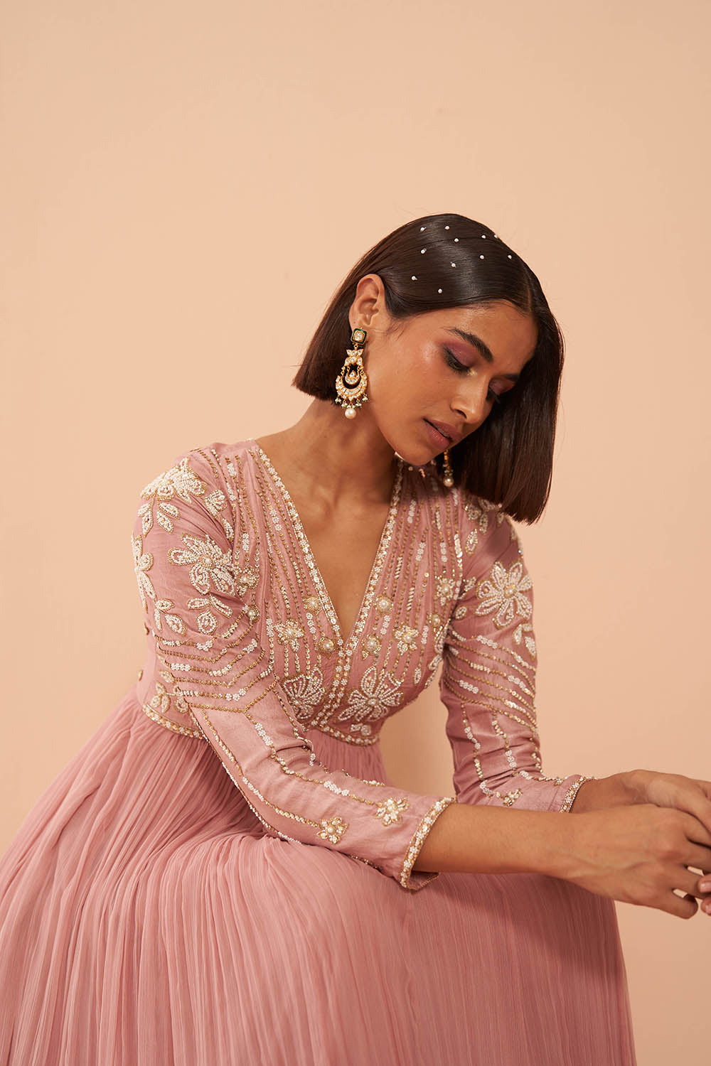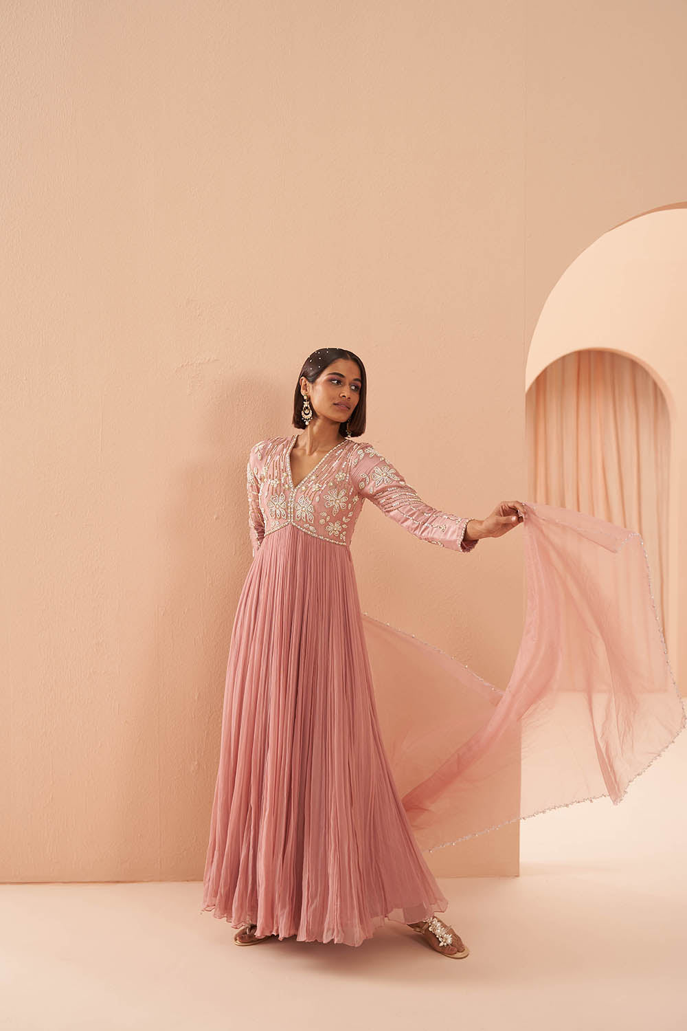 Pearl embelished anarkali set with organza dupatta
