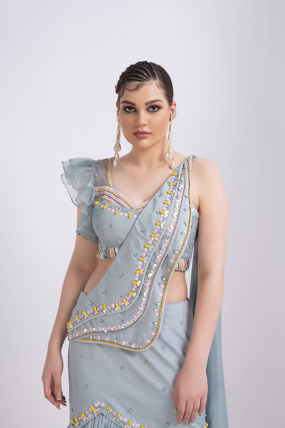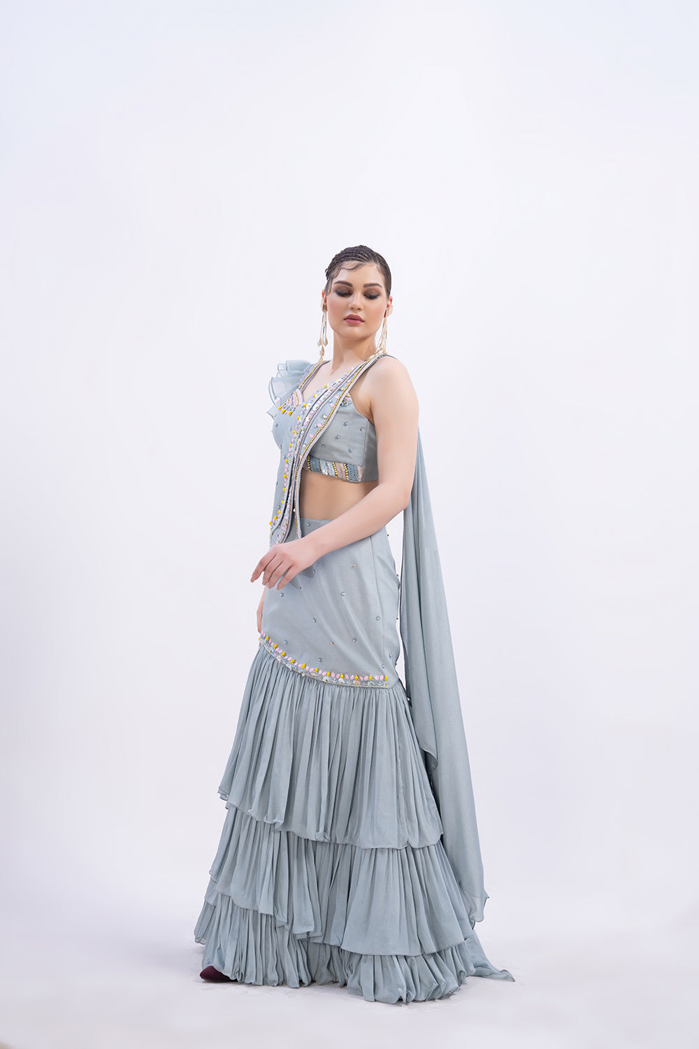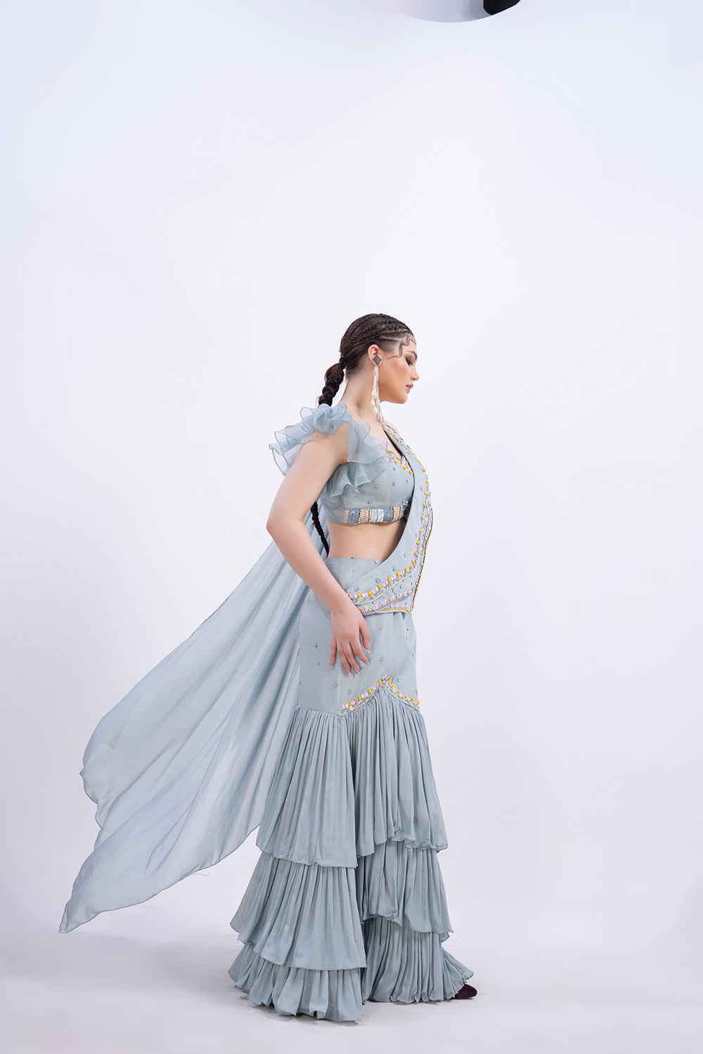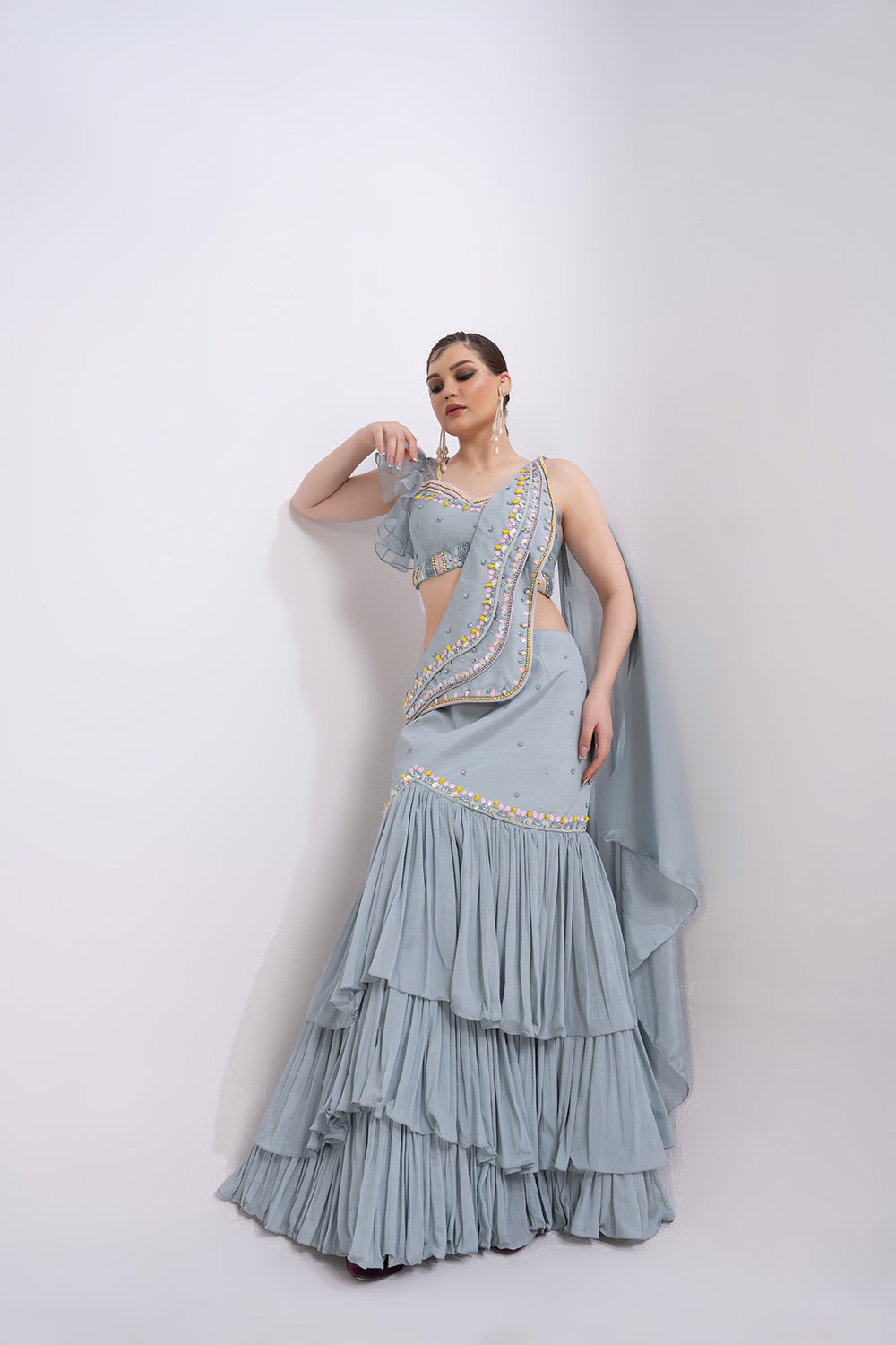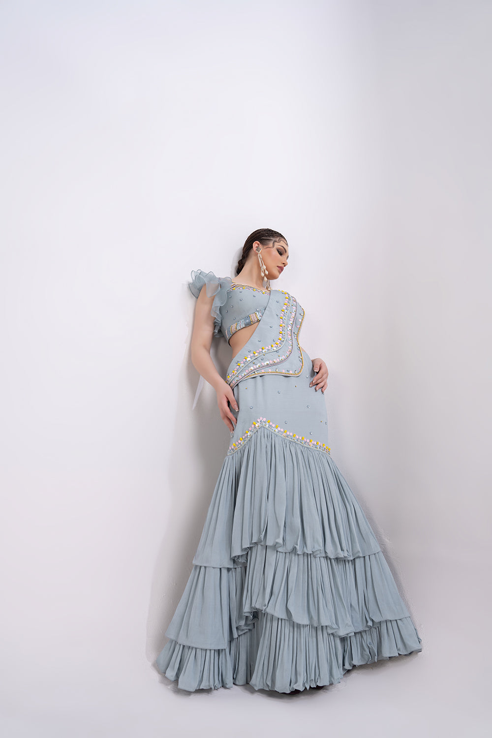 Powder Blue Fish cut Ruffle Saree in Chiffon fabric with multi colour embellishment on Blouse and Front pallu.