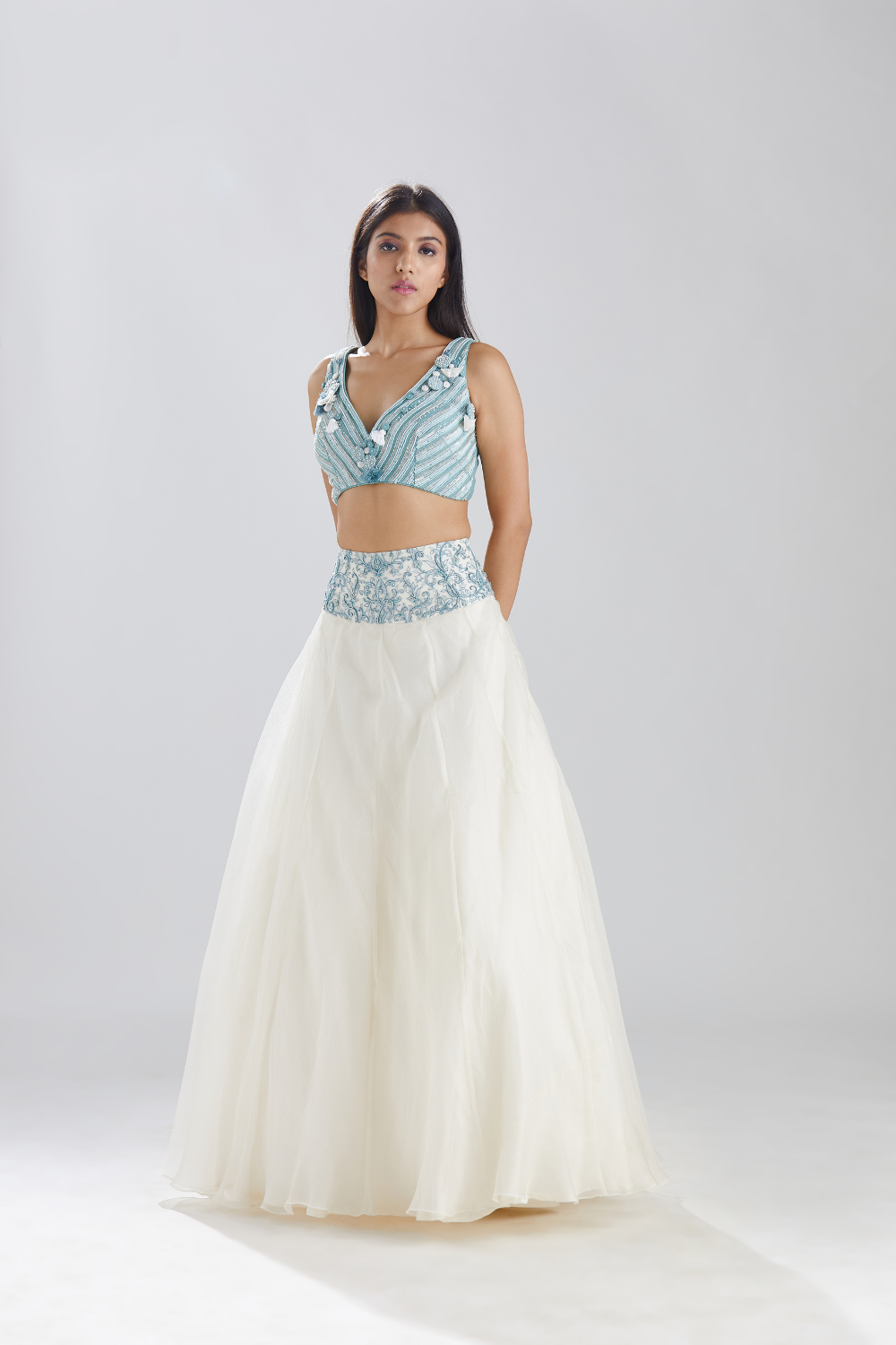 The Aqua bustier is meticulously hand embroidered with sequins, bugle beads, embroidered buttons and tassels