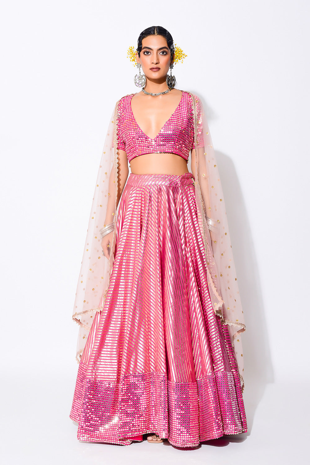 Featuring a sparkly peach ensemble embroidered and embellished with sequins giving a festive essence.
