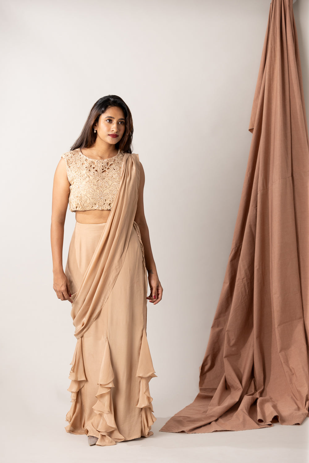 Crochet Hand Embellished Blouse With Crepe Silk Pleated Saree