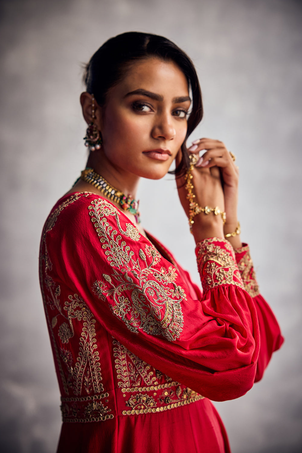 Red angarakha style kurta set with gold thread embroidery highlighted with various embellishments. Paired with churidars.