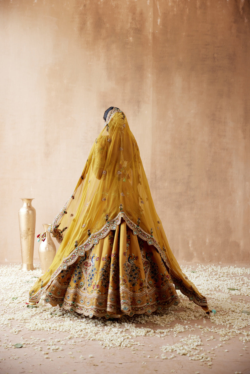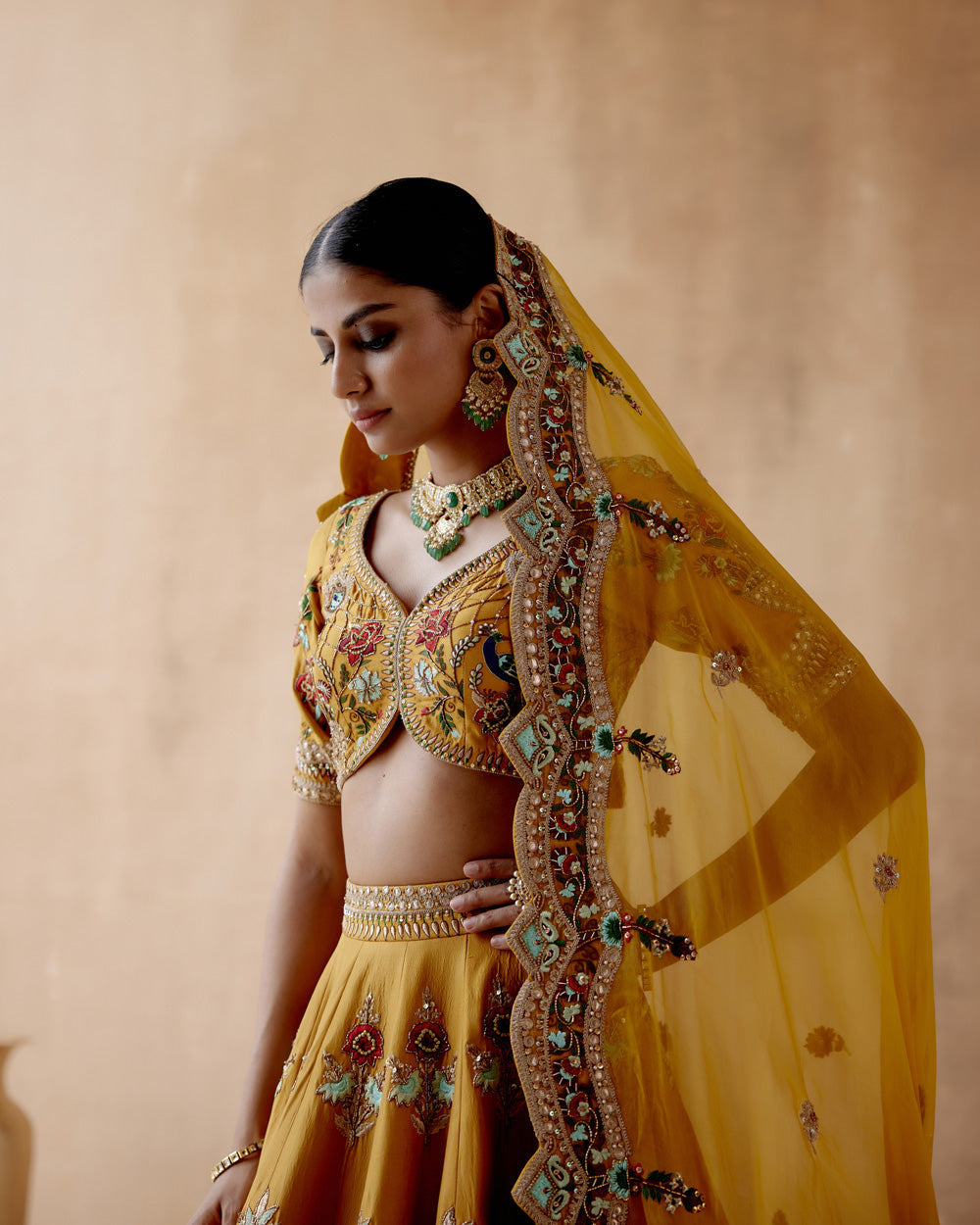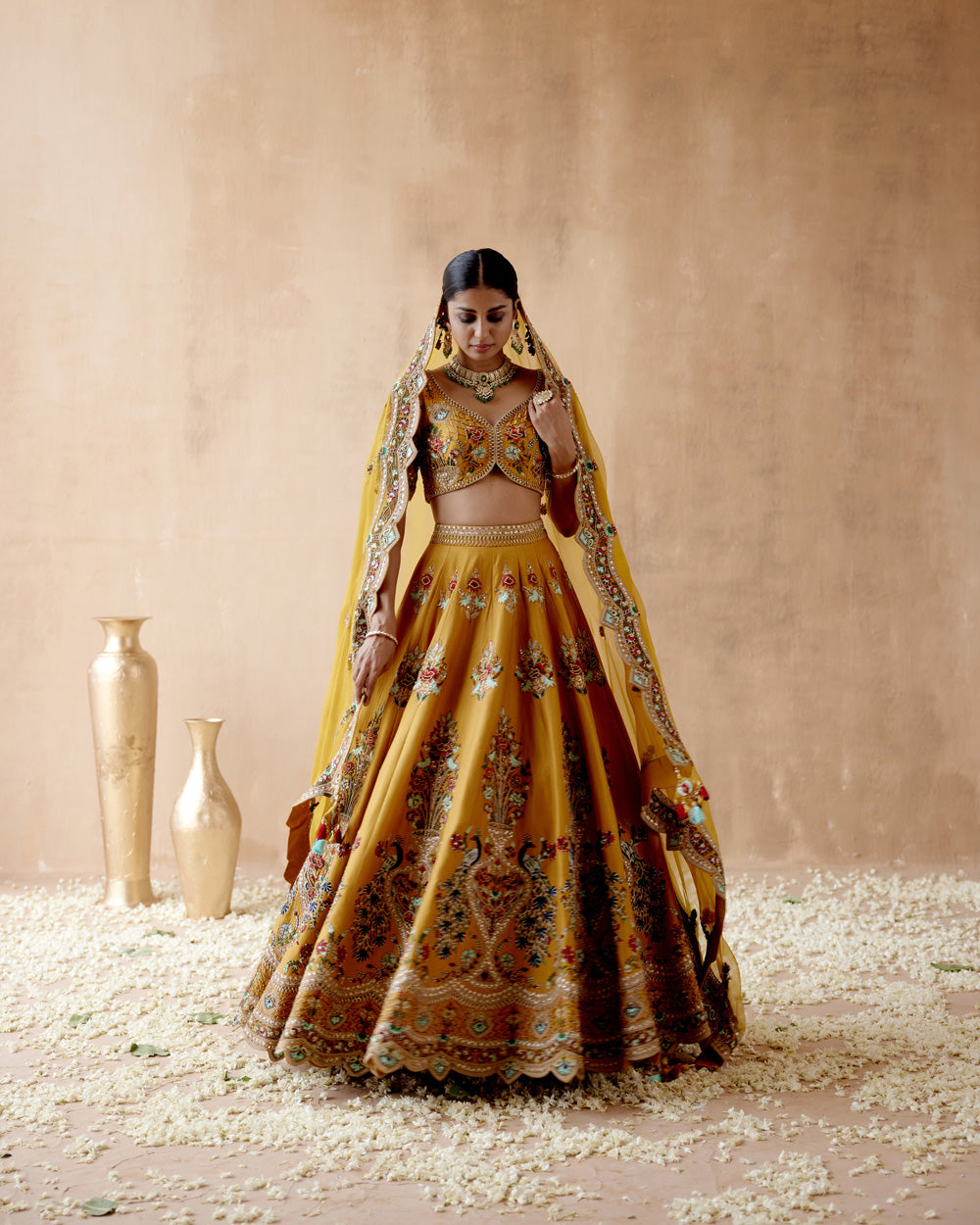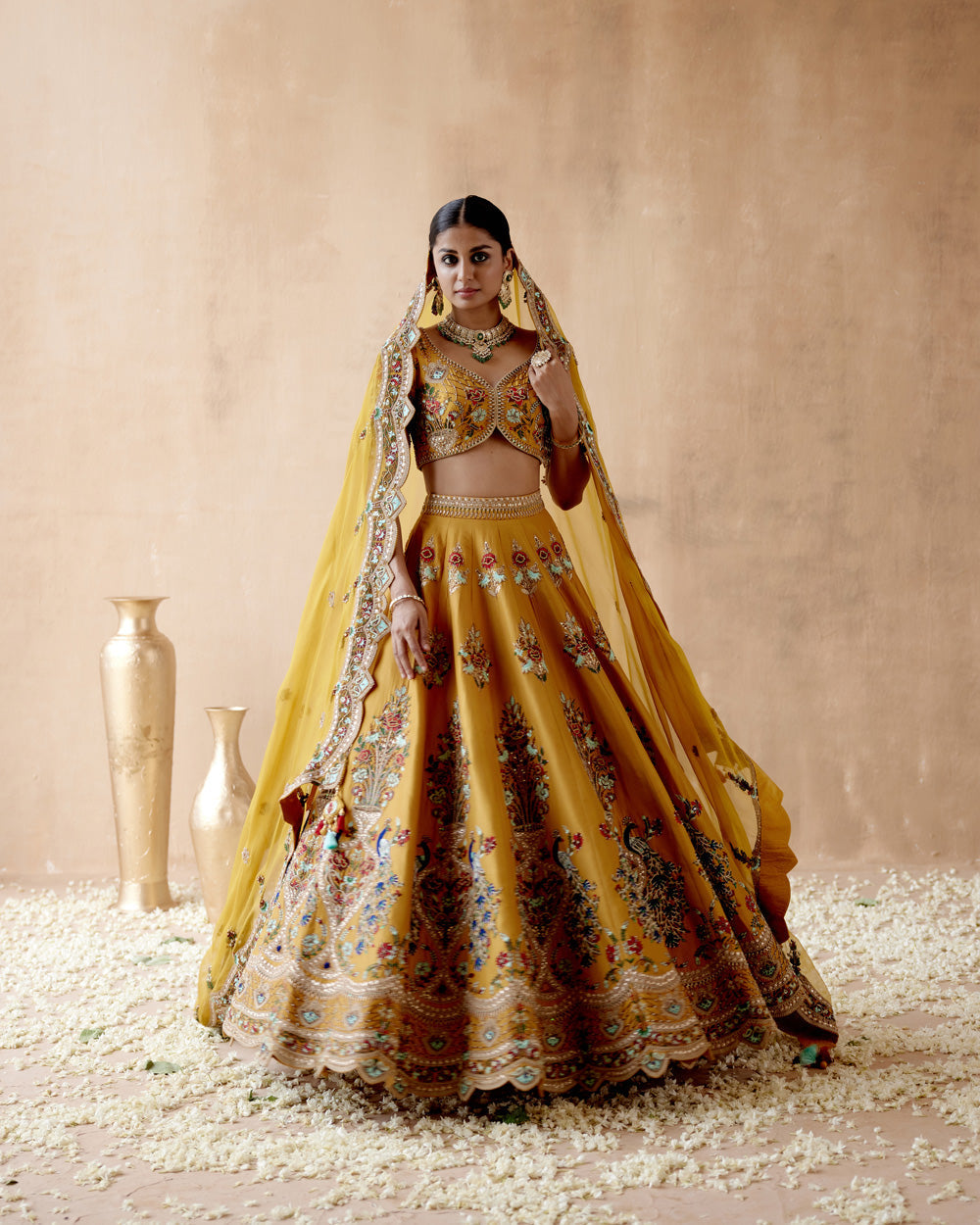 Mustard dupion silk lehenga set with floral thread embroidery highlighted with various embellishmens. paired with embroidered blouse and dupatta.