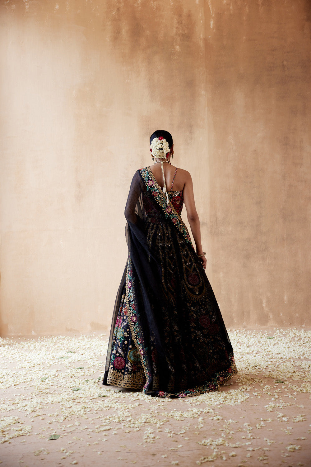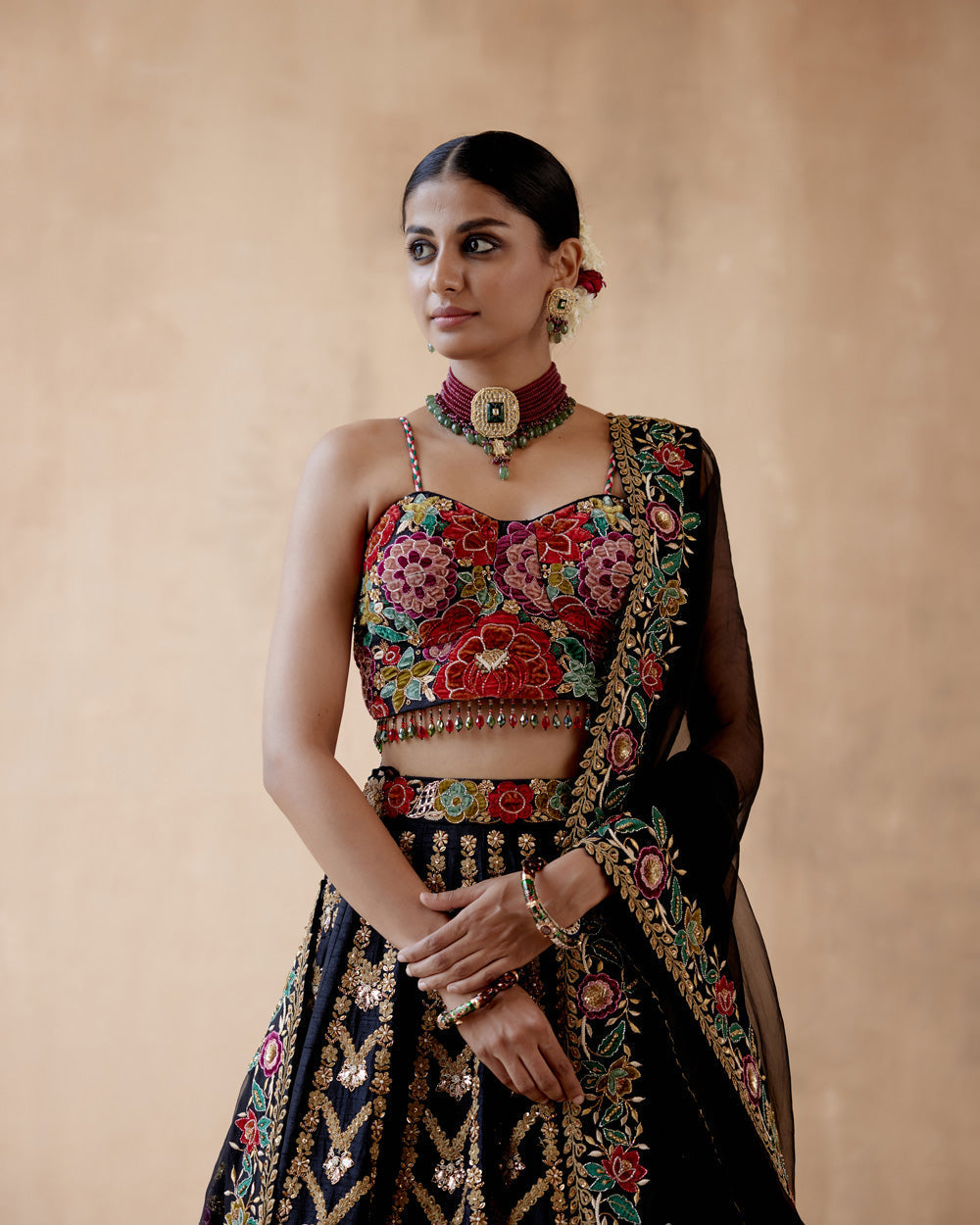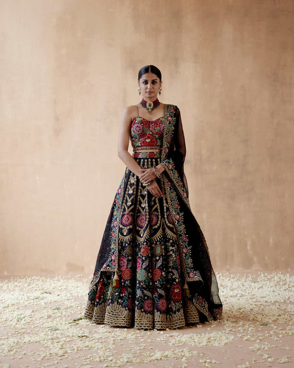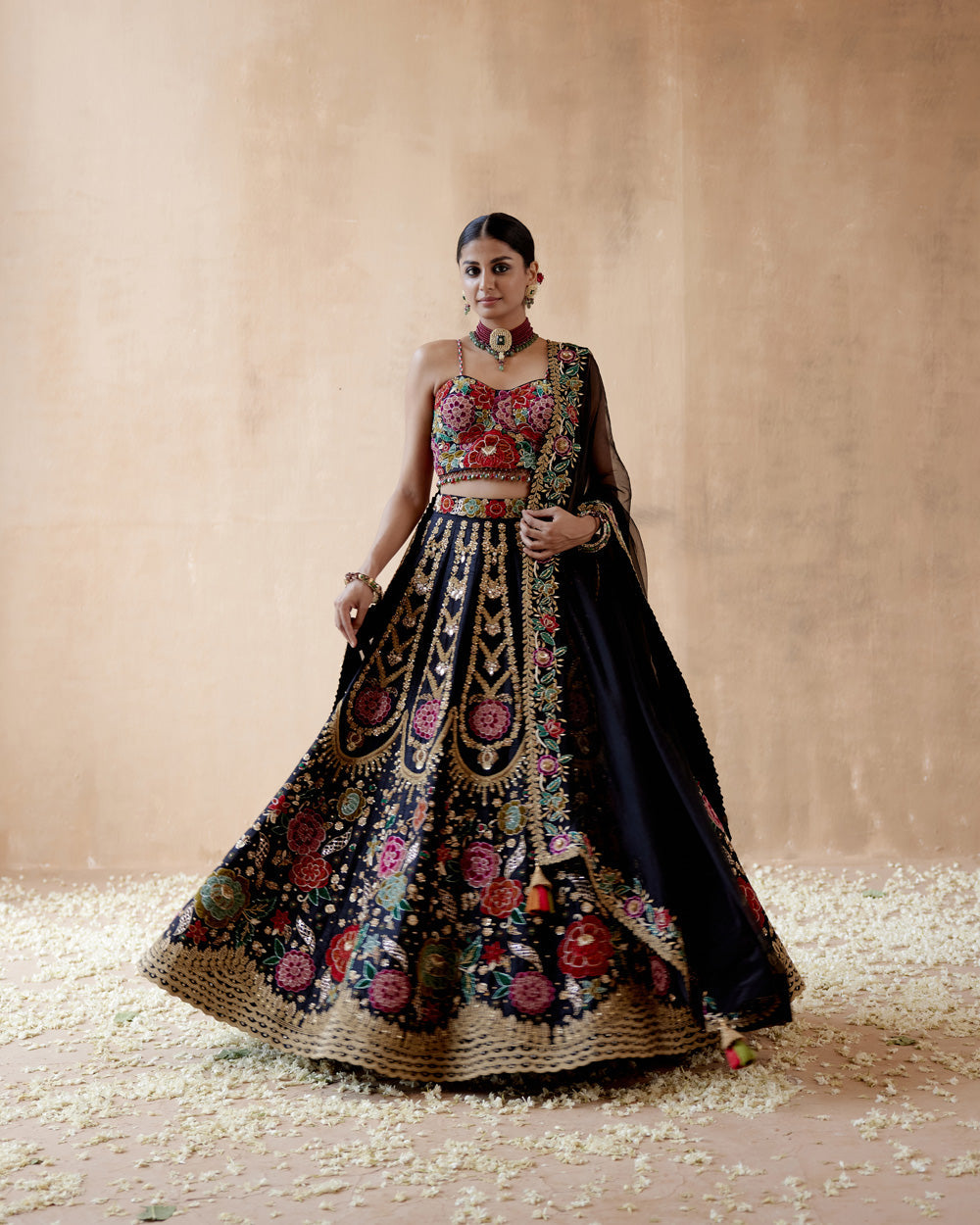 Black raw silk lehenga set with floral thread embroidery highlighted with various embellishmens. paired with embroidered blouse and dupatta.