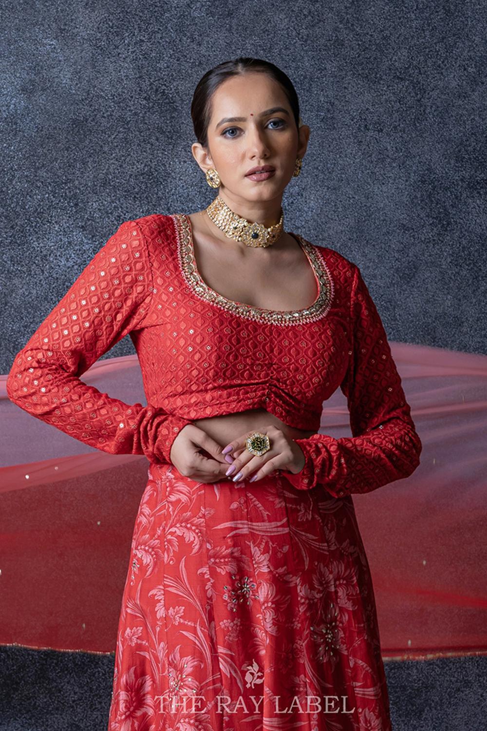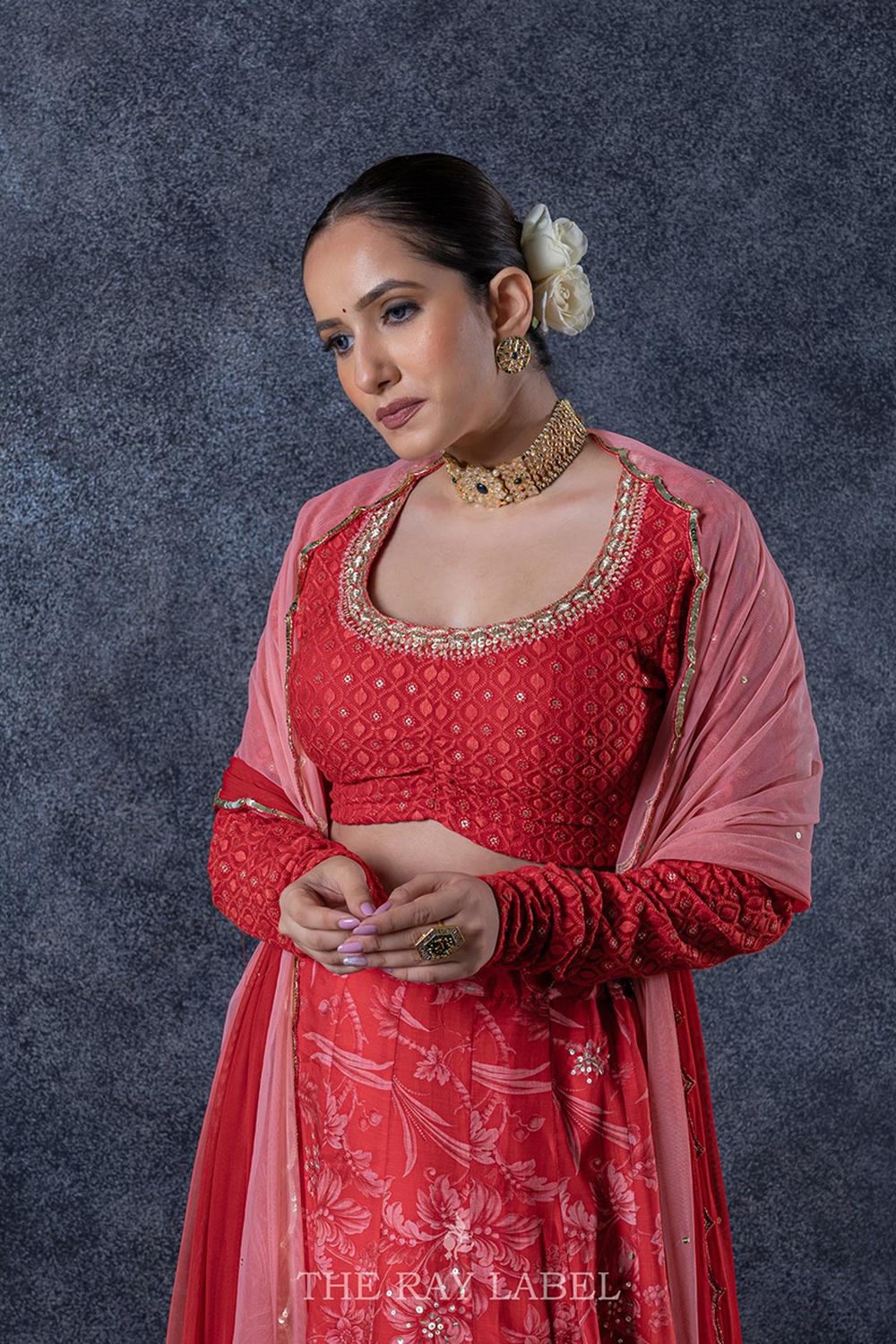 This three piece set includes lehenga, churidar blouse and dupatta.