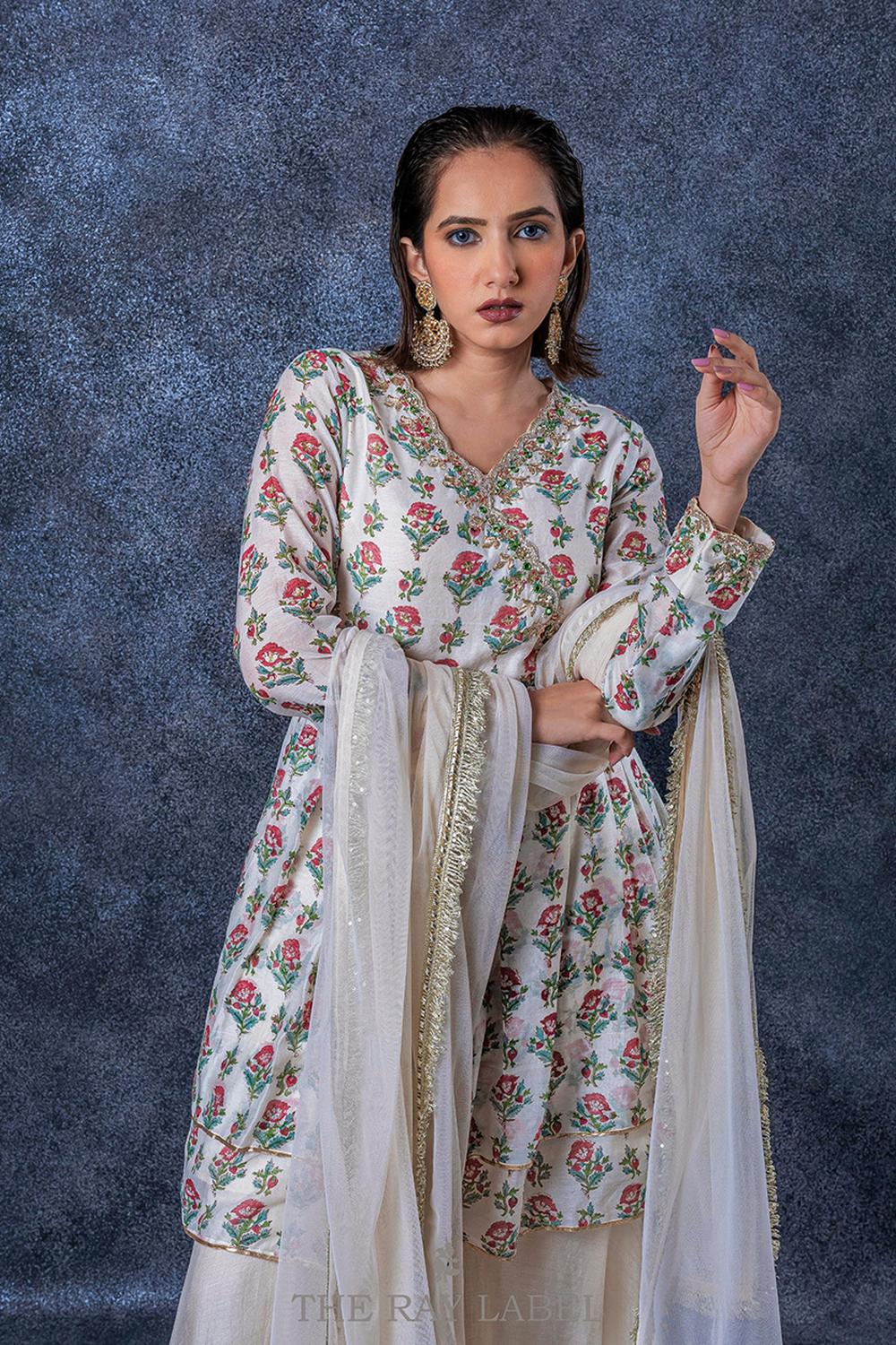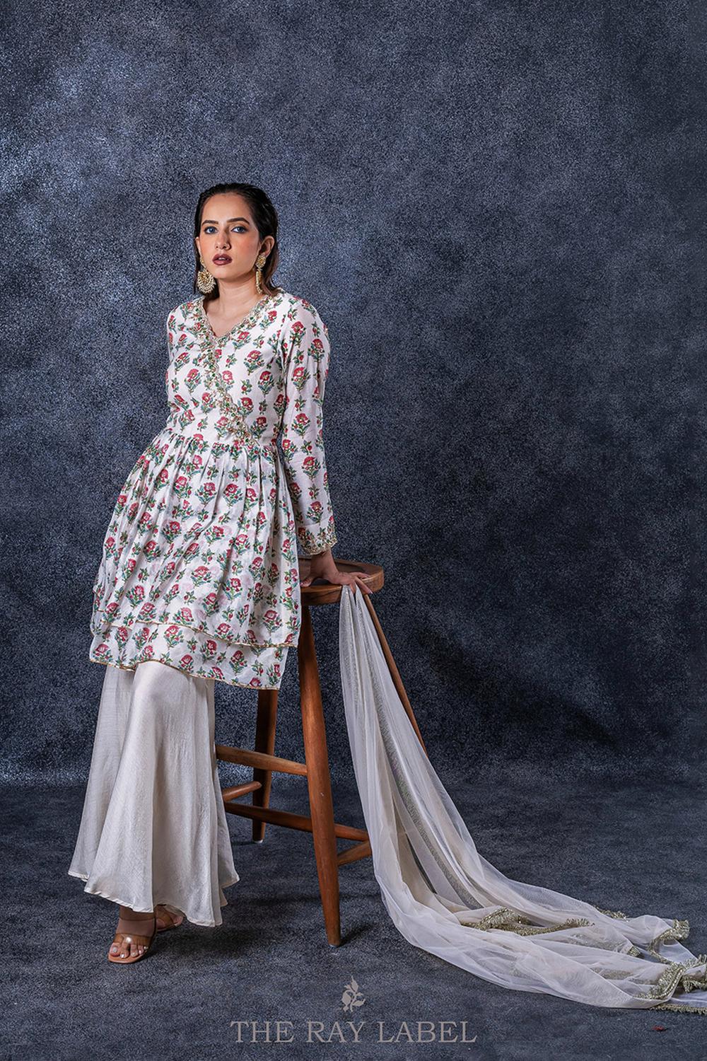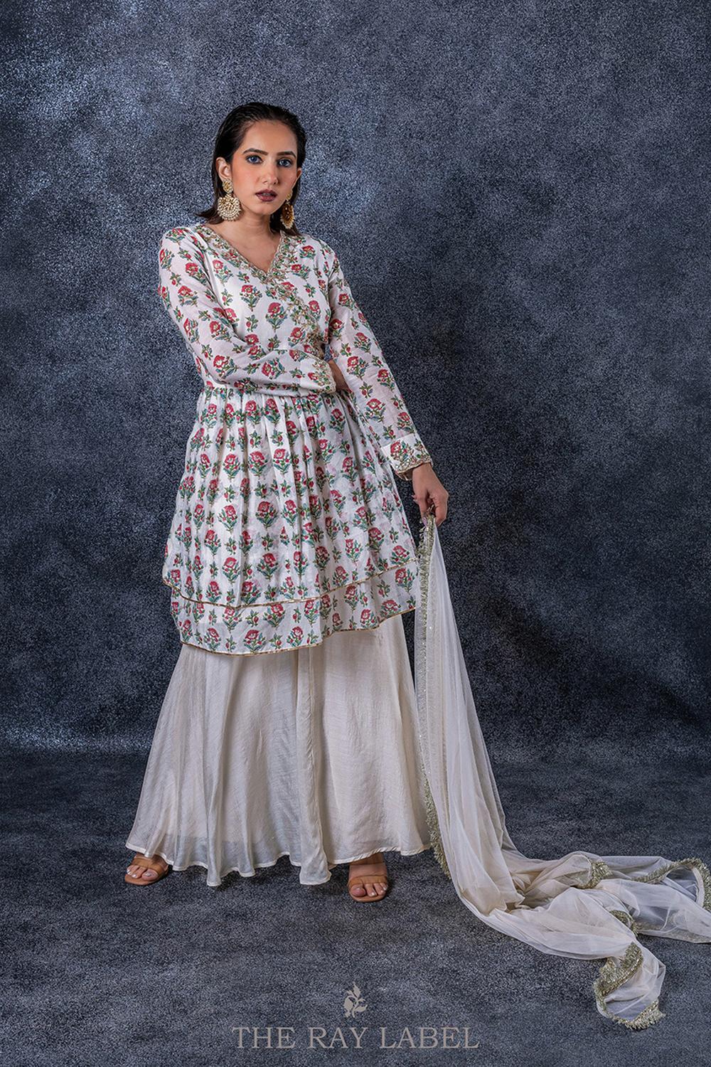 This three piece set includes block printed ivory peplum, sharara pants and dupatta.