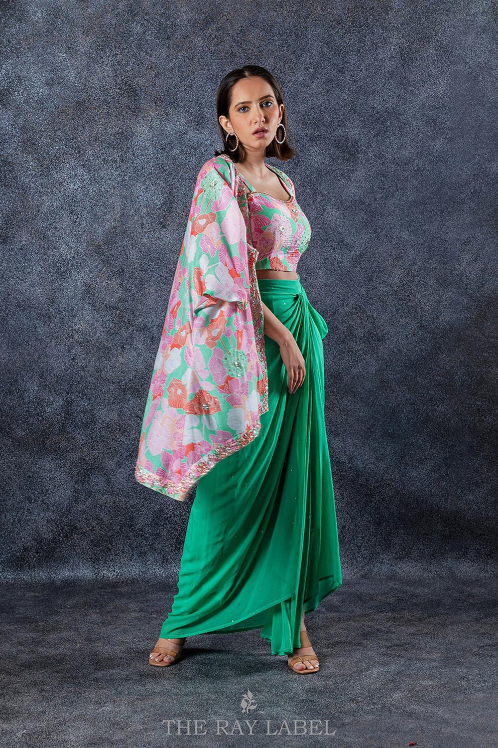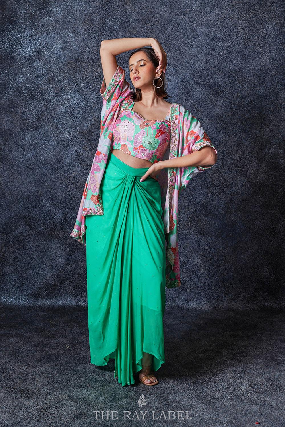 4. assymetrical floral jacket with zardosi embroidered borders and sleeves cuffs.
