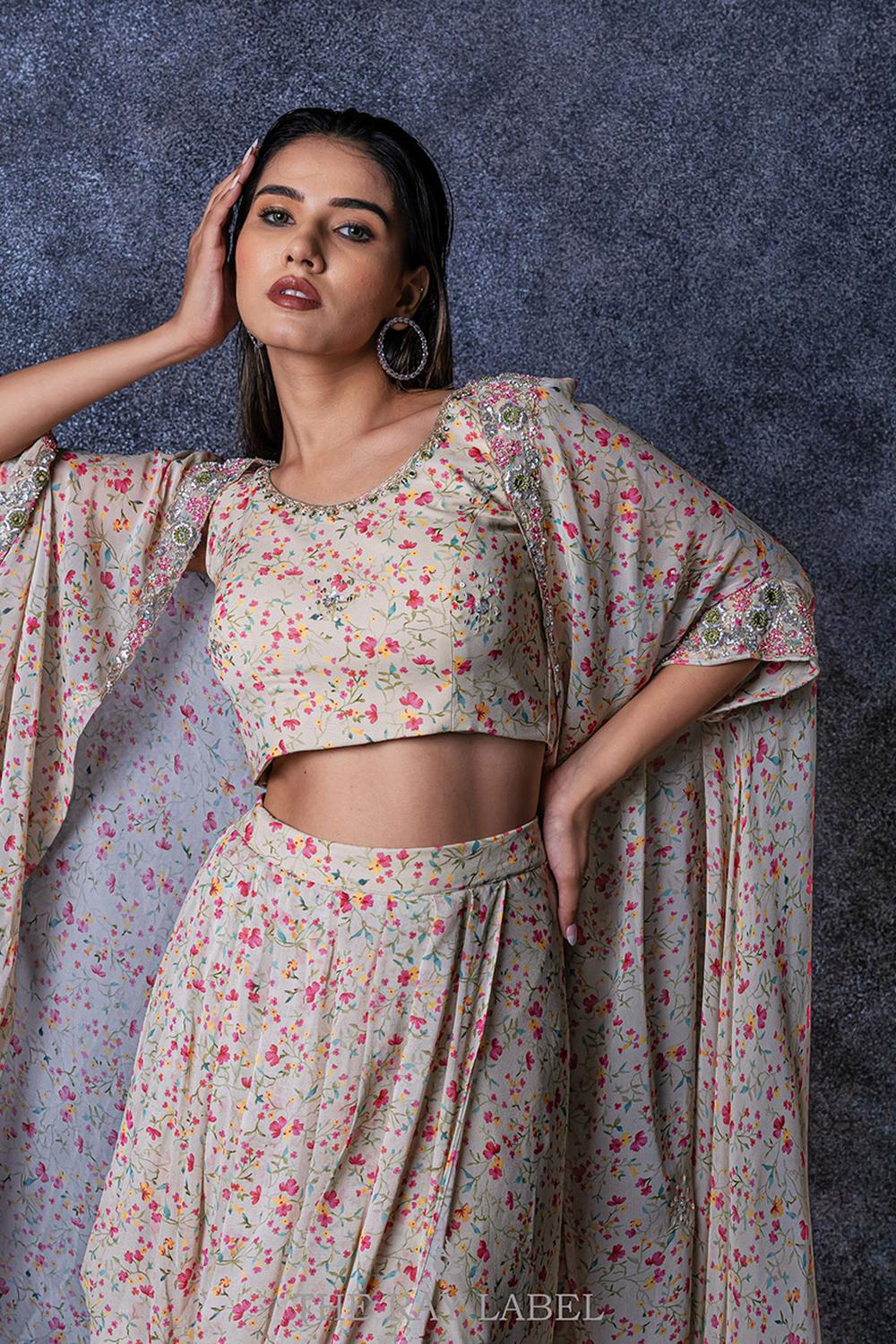 This three piece set includes pre draped skirt, blouse and cape jacket.