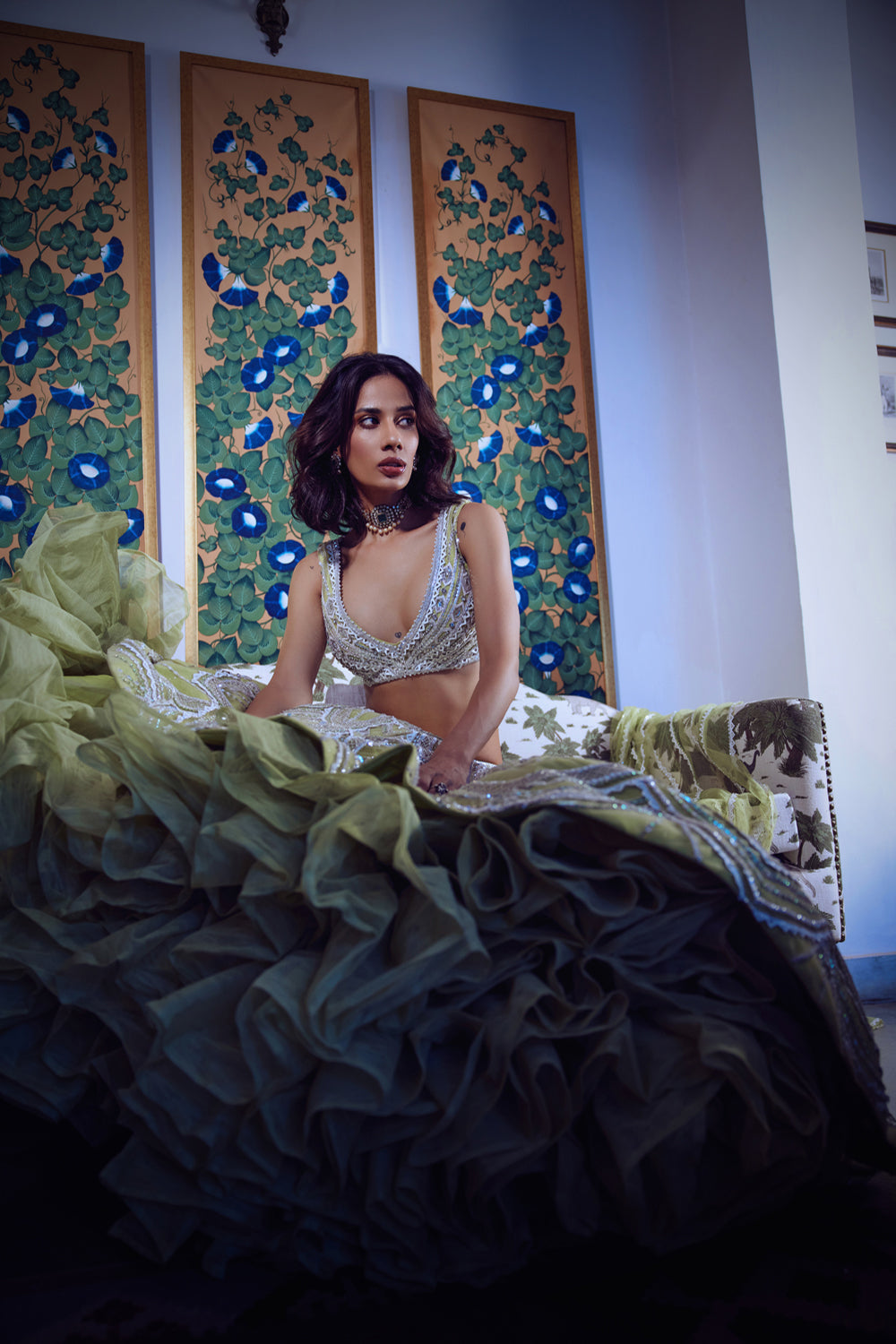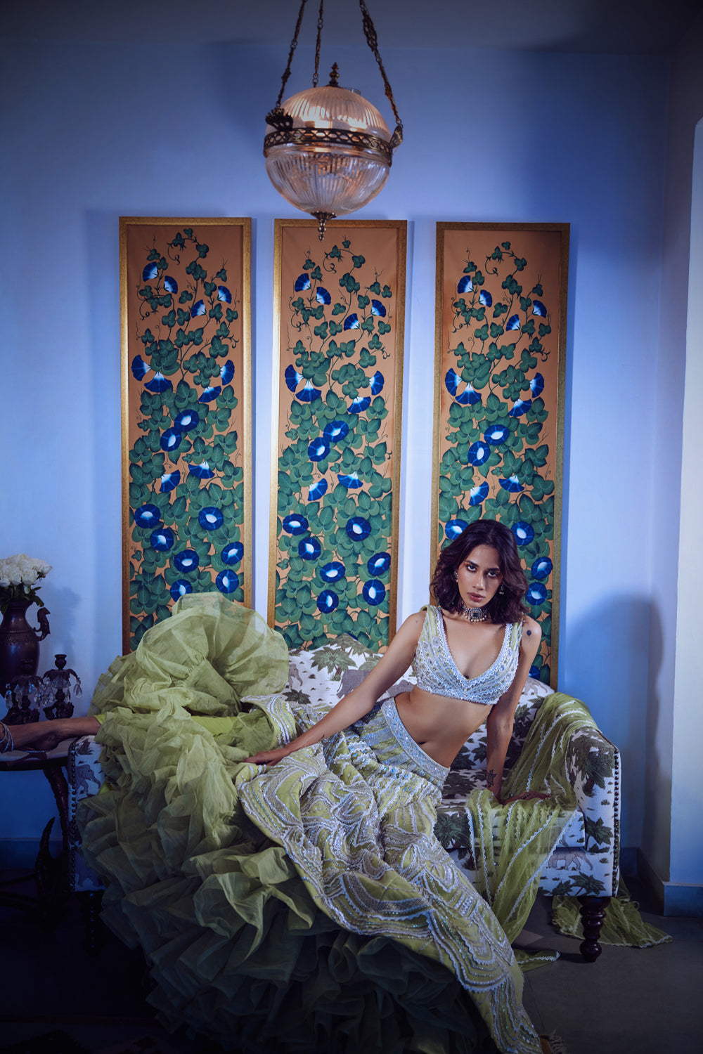 Key lime lehenga featuring our signature leather strip appliqué work with ivory hand embellishments, blouse and a tulle dupatta.