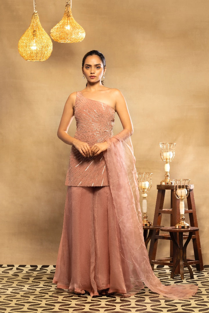 ROSE PINK ONE SHOULDERED HAND EMBROIDERED KURTI WITH ORGANZA DUPATTA AND SHARARA