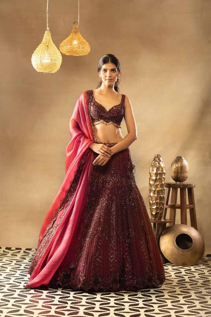 HEAVILY EMBELLISHED LEHENGA WITH TASSEL DETAILING IN THE SHADE OF CRANBERRY RED AND AN ORNATE SEQUINNED BUSTIER WITH EMBROIDERED ORGANZA DUPATTA WITH SCALLOP DETAILING.